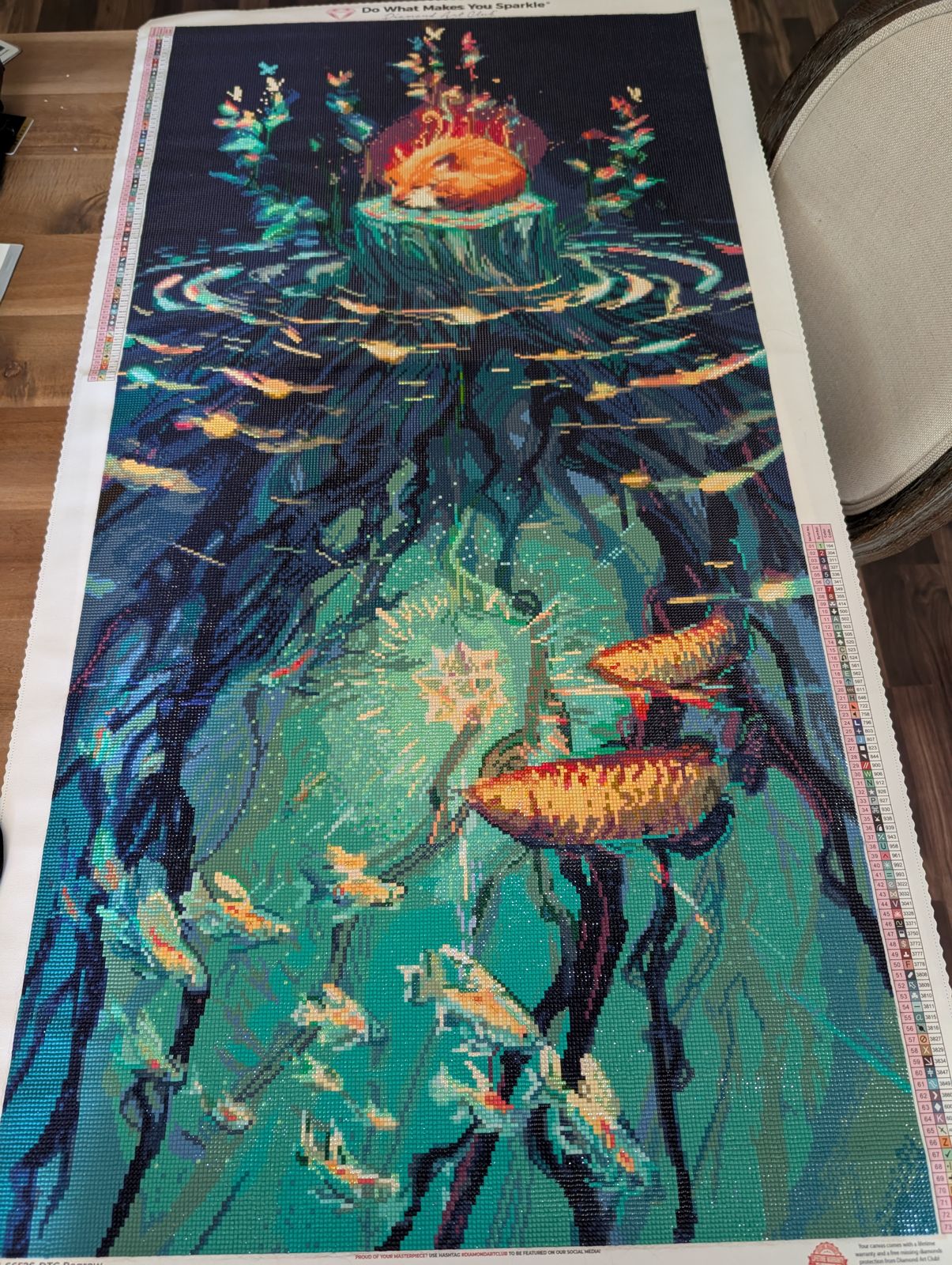 I am not only obsessed with foxes and fish, but I am in love with the color palate. It's a good balance of color blocking and confetti - and the colors pop in all the best ways. I've been working on it for about a week and couldn't love the progress I've made more if I tried.