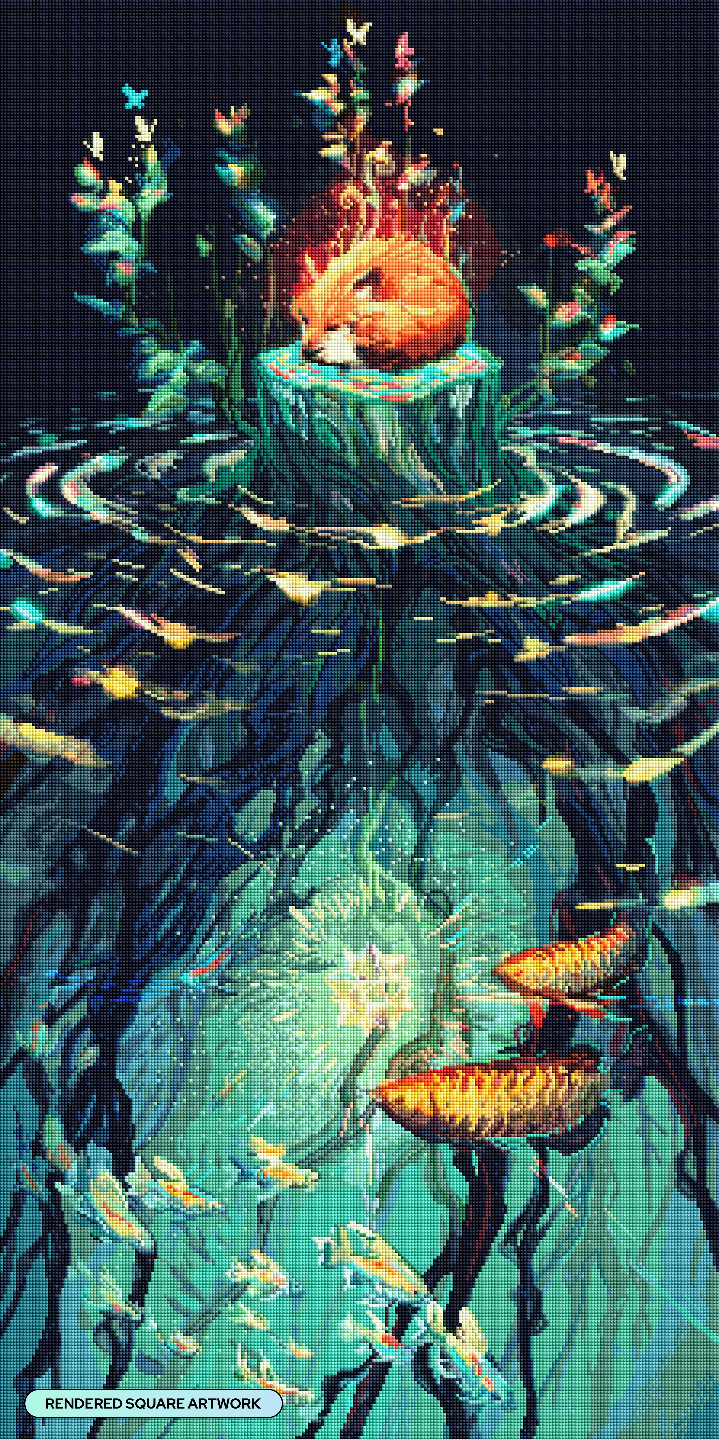 Drift into the ethereal slumber of the fox, nestled atop a mystical stump in the twilight of dreams. An energized crystal breathes new life into the silent symphony of the underwater, where roots and fin flutter in harmony.