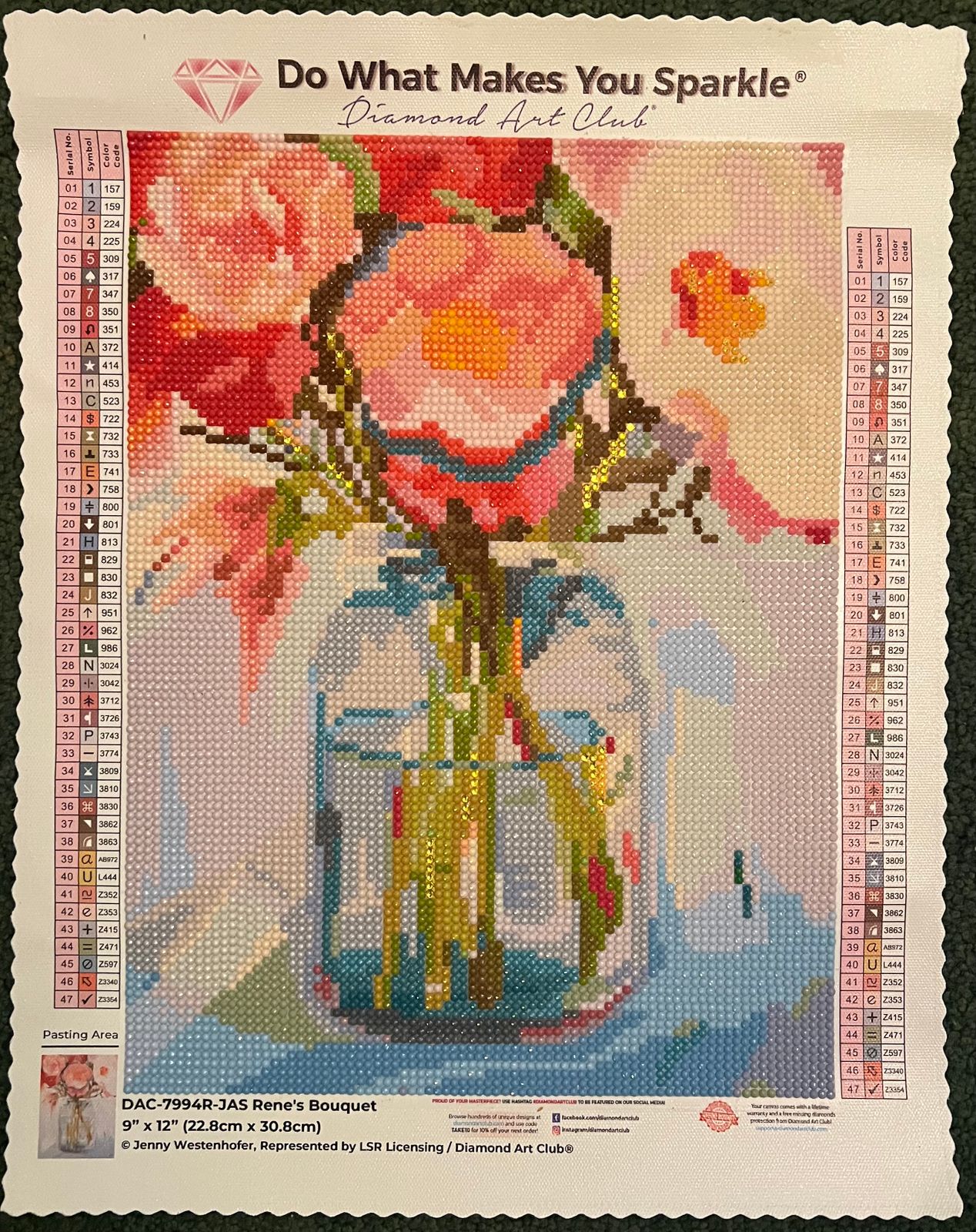 Sometimes the bigger canvases are just too much to handle, especially when you're taking them on vacation. You know what is perfect? These smaller DAC kits, particularly Rene's Bouquet! Even though it's small, the color spread is mighty! I was nervous about the light background, but it turned out beautiful, but that could be because it has rounds instead of squares. The variations of pinks and blues with special drills speckled throughout really make this a special canvas. The best part? I knocked it out in a day! A day! It not only gave me a sense of accomplishment, but a lovely piece of art to bring out in the spring/summer. Highly recommend!