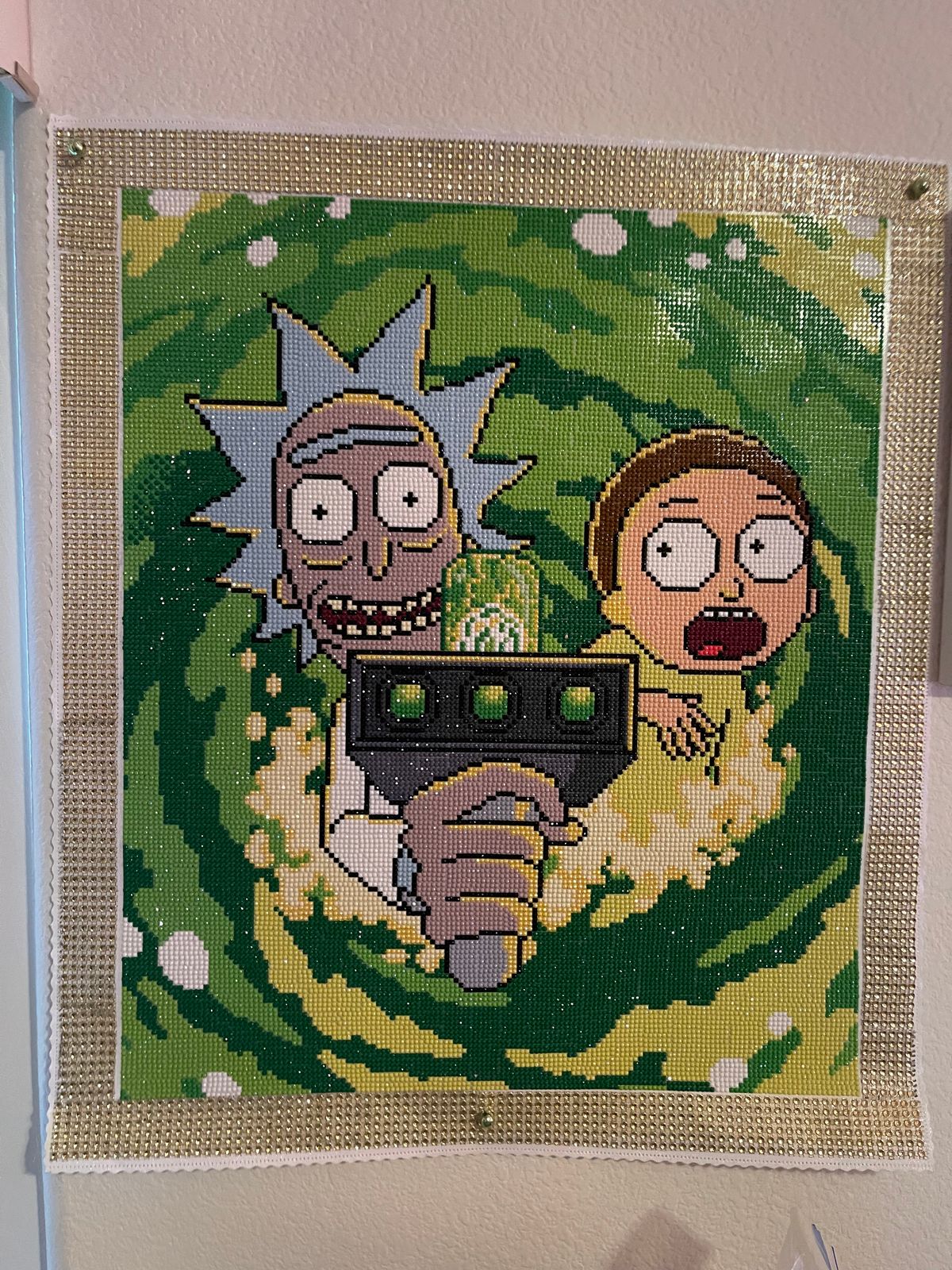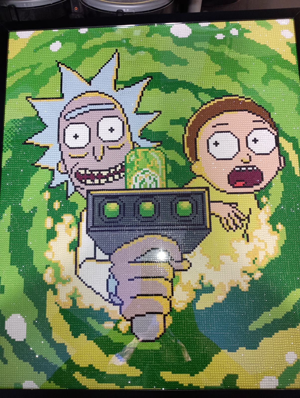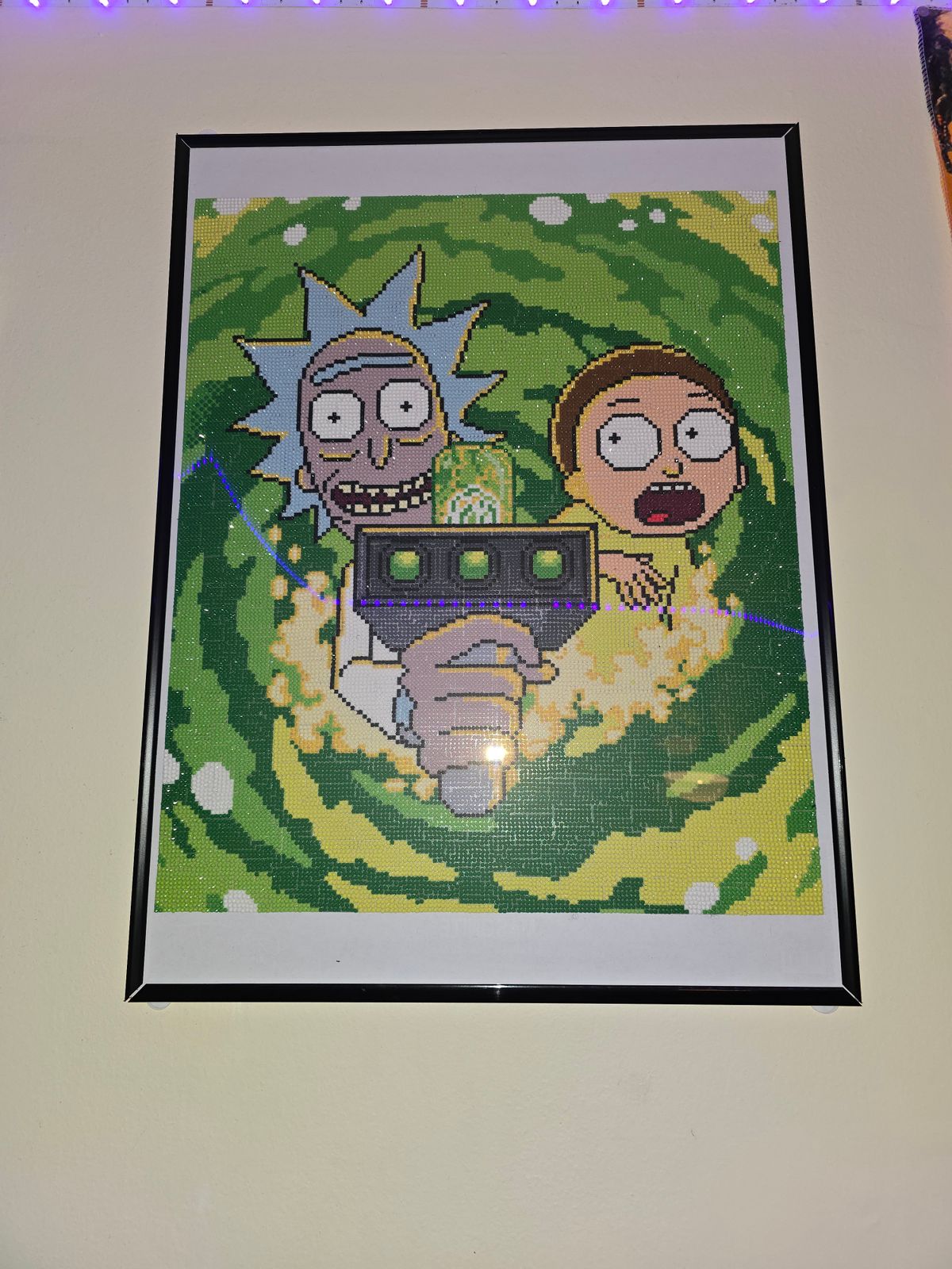 Hello! A big Rick and Morty fan here. I finished this painting back in June, took me almost 2 weeks to complete. I had a lot of fun doing this one, I would definitely recommend it for anyone that likes color blocking. I do feel like the price is much for a smaller painting with 1 AB color, but I made an exception because there is only 2 Rick and Morty paintings on this site. I decorated it the frame and it matches with my little plushies!