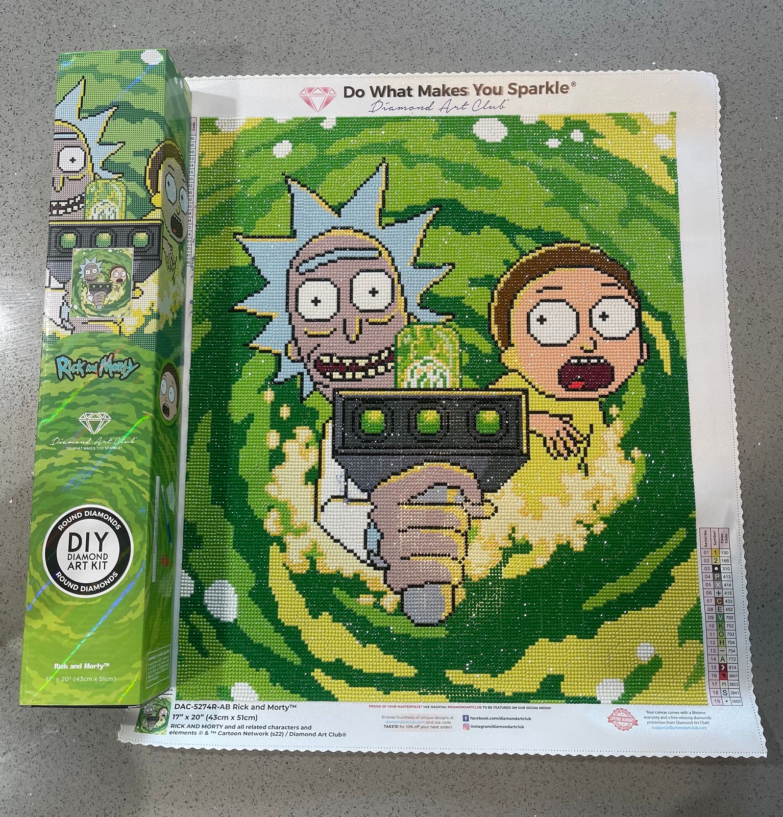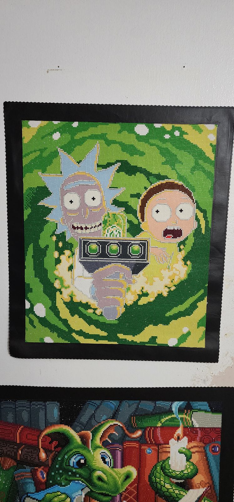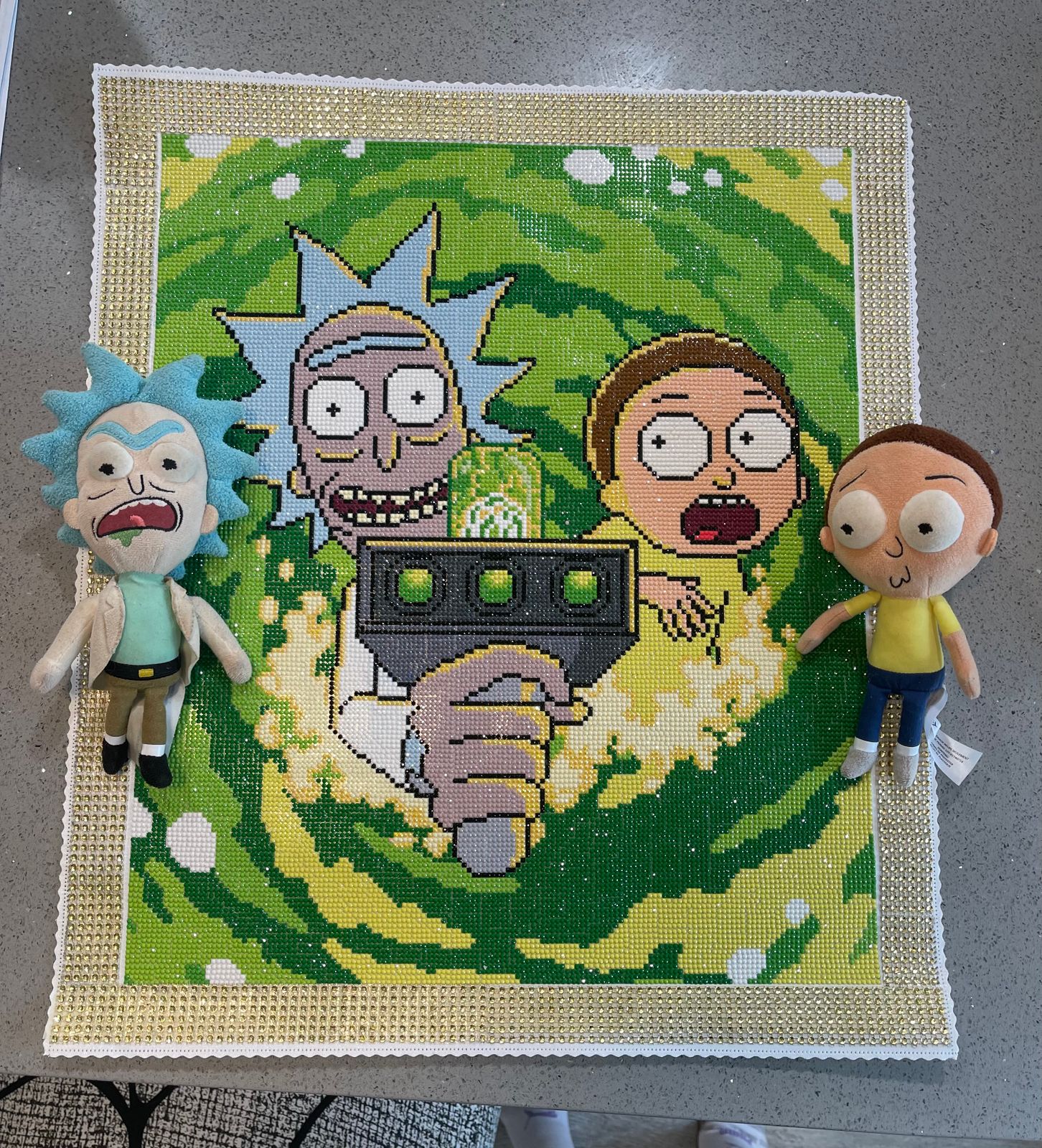 Hello! A big Rick and Morty fan here. I finished this painting back in June, took me almost 2 weeks to complete. I had a lot of fun doing this one, I would definitely recommend it for anyone that likes color blocking. I do feel like the price is much for a smaller painting with 1 AB color, but I made an exception because there is only 2 Rick and Morty paintings on this site. I decorated it the frame and it matches with my little plushies!
