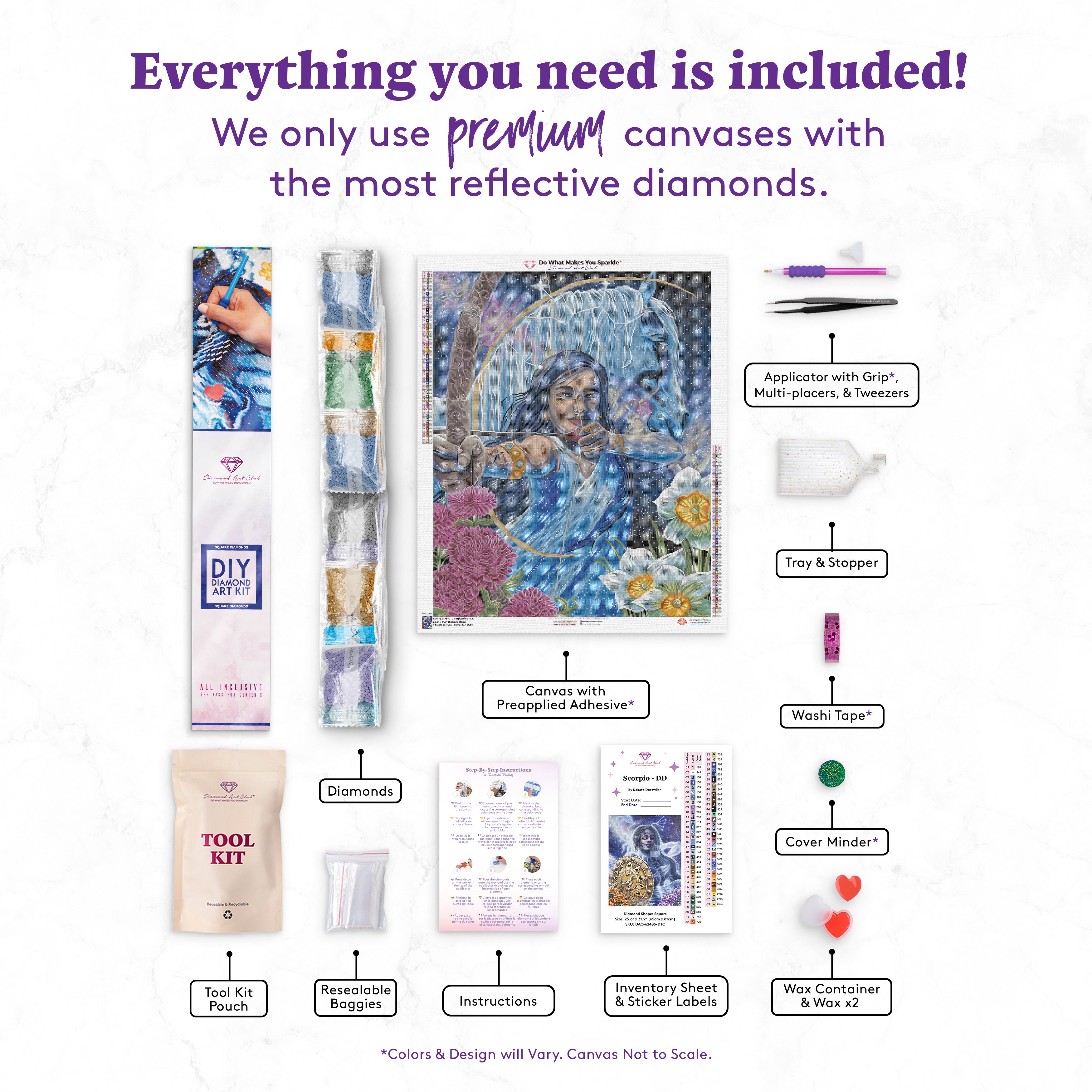 Canvas x 1, Diamonds, Tray x 1, Applicator + Grip x 1, Wax x 2, Tweezers x 1