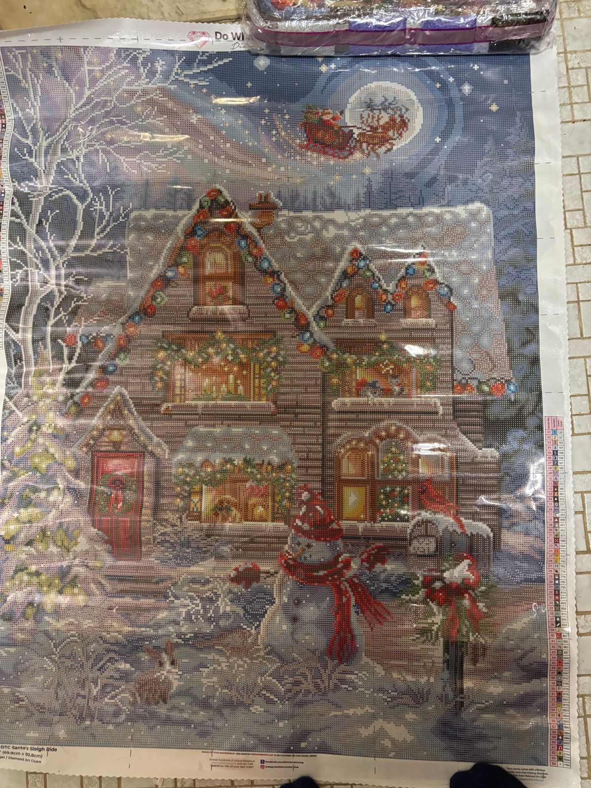 I love how this piece is the same house as the Halloween house by Dona Gelsinger, but now is decorated beautifully from roof to foundation for the Christmas season! With Santa flying overhead, it is the perfect scene for Yuletide bliss.