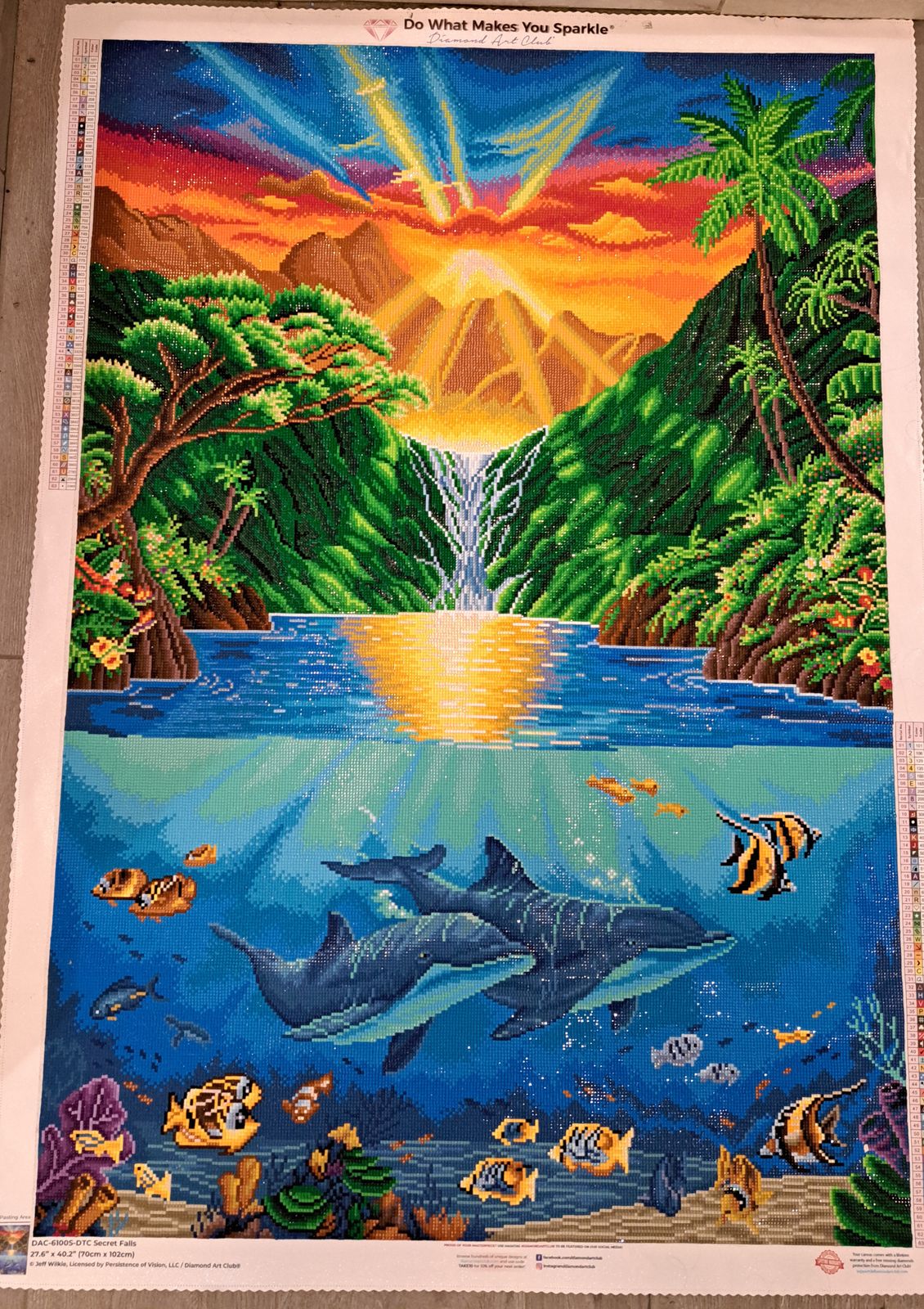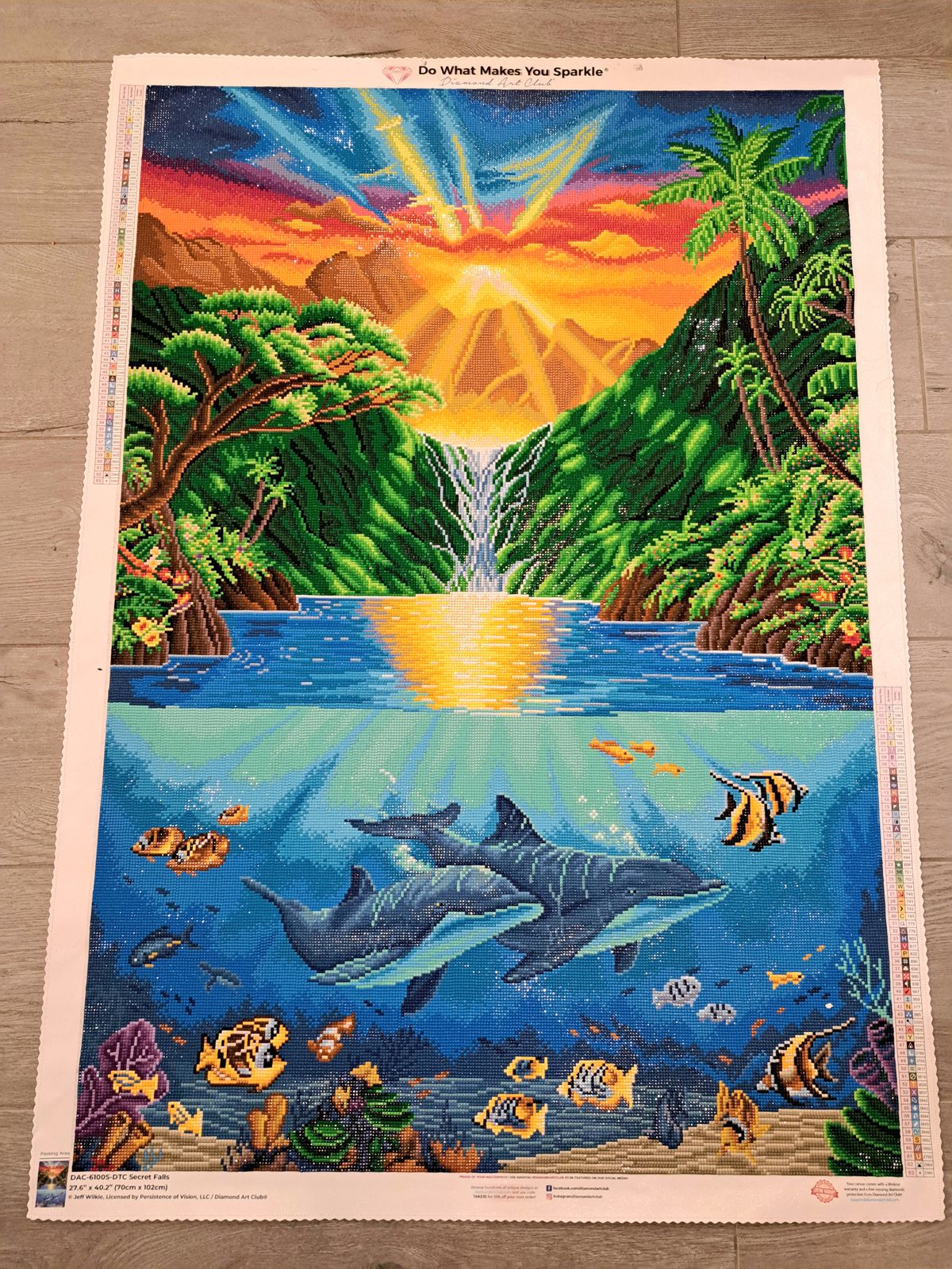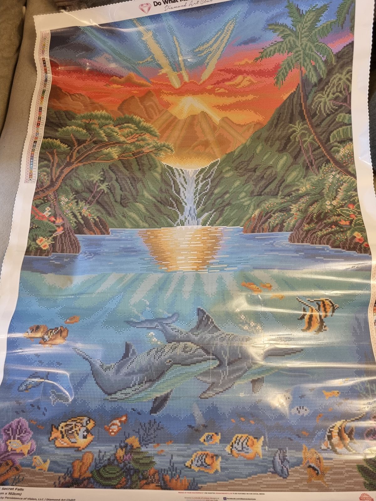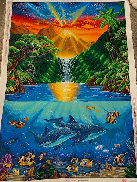 Beautiful canvas to work on. Colors bright, nice dream scape on the wall of somewhere tropical to go and relax. Alwaus great choices to pick with Diamond Art club. Lots of color blocking multiples work well for me.