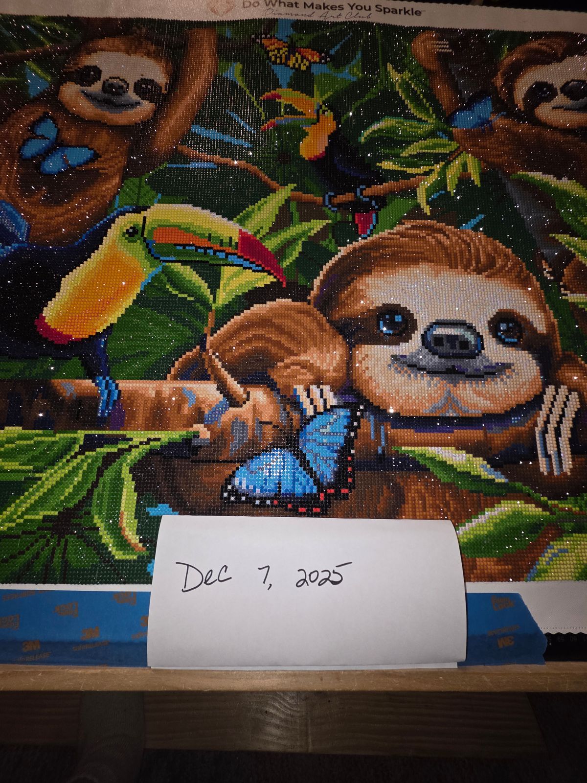My brother loves sloths so I had to get this when it restocked. This is the first round Diamond Art Club kit I have done, also the first largest round canvas. The bargain kits that I started on, I always needed a mesh ruler to keep the drills aligned. I was really worried when all the mesh rulers wouldn't align. I was really surprised how easy it was to keep the drills lined. Once I started doing square kits it was hard to go back to rounds, I decided it wasn't the drills but the actual kits. I am a die hard Diamond Art Club fan girl! I am now really interested in doing round drill kits, and even more kits on my wishlist. My husband isn't thrilled because my wishlist is I the hundreds already! I thank you for such a great product, my bank account, not so much, love everything I have gotten so far. The kits are the best, the customer service is the best. I LOVE this company and have spread the word to my friends and family, including Facebook. I want everyone to know how great this company and products really are. The drills really sparkle, and I really had to force myself to start on this kit. I prefer landscapes so this isn't my normal canvas. Once I started it I really enjoyed working on it, I have a few more round kits. I had pushed to the side but no longer after seeing the end result. The few rounds I do have I bought by mistake ot in mystery boxes. After the holidays I plan on working on them.
