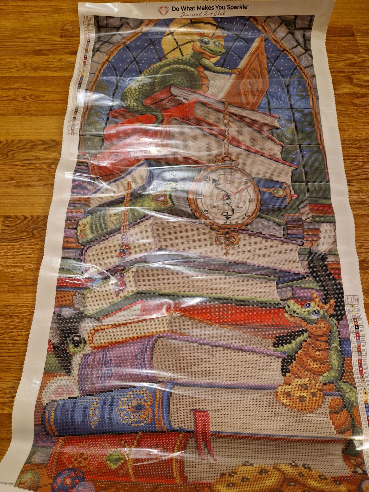 This is a large canvas 22”x 43” filled with colorful details of books and a peek-a-boo cat, cookies and of course draglings . I did experience some initial diamond “ popping” but it seemed to improve as I completed more. The finished canvas will be framed and be an integral part of my “ book nook” area for my grandchildren.