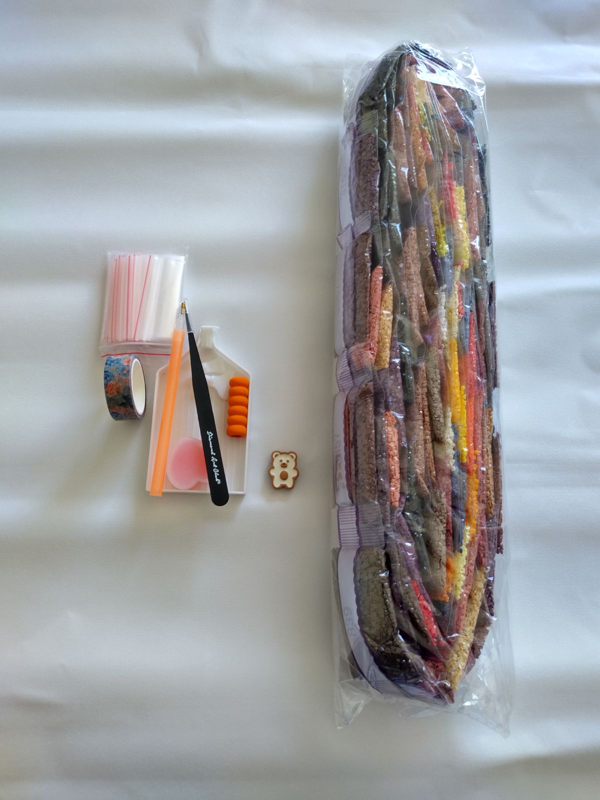 Canvas x 1, Diamonds, Tray x 1, Applicator + Grip x 1, Wax x 2, Tweezers x 1