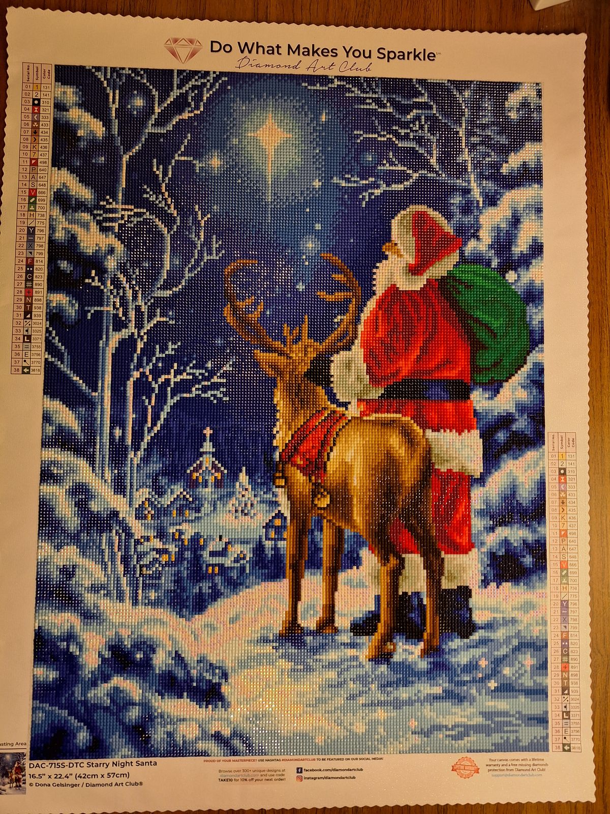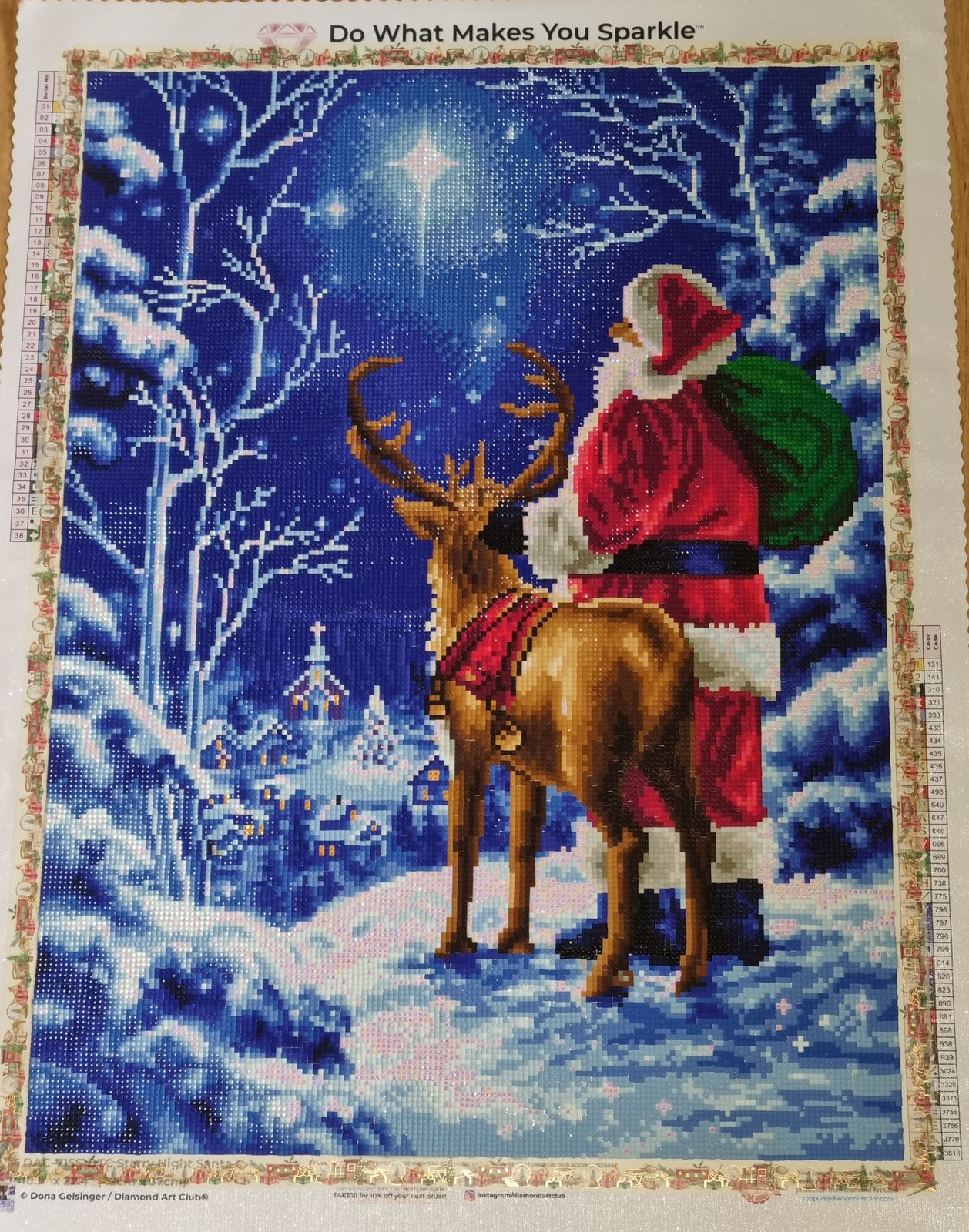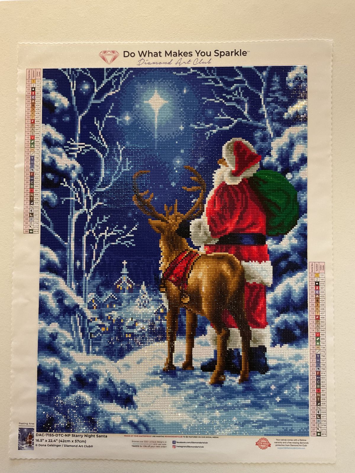 I LOVE DAC products and this Santa doesn’t disappoint. It’s so sparkly and beautiful. My husband says when I move it it looks like the lights turn on in the town. I love how the church is enlarged. If you haven’t tried Diamond Art Club kits then you’re missing out on the best of Diamond paintings. This one does have a lot of color blocking.