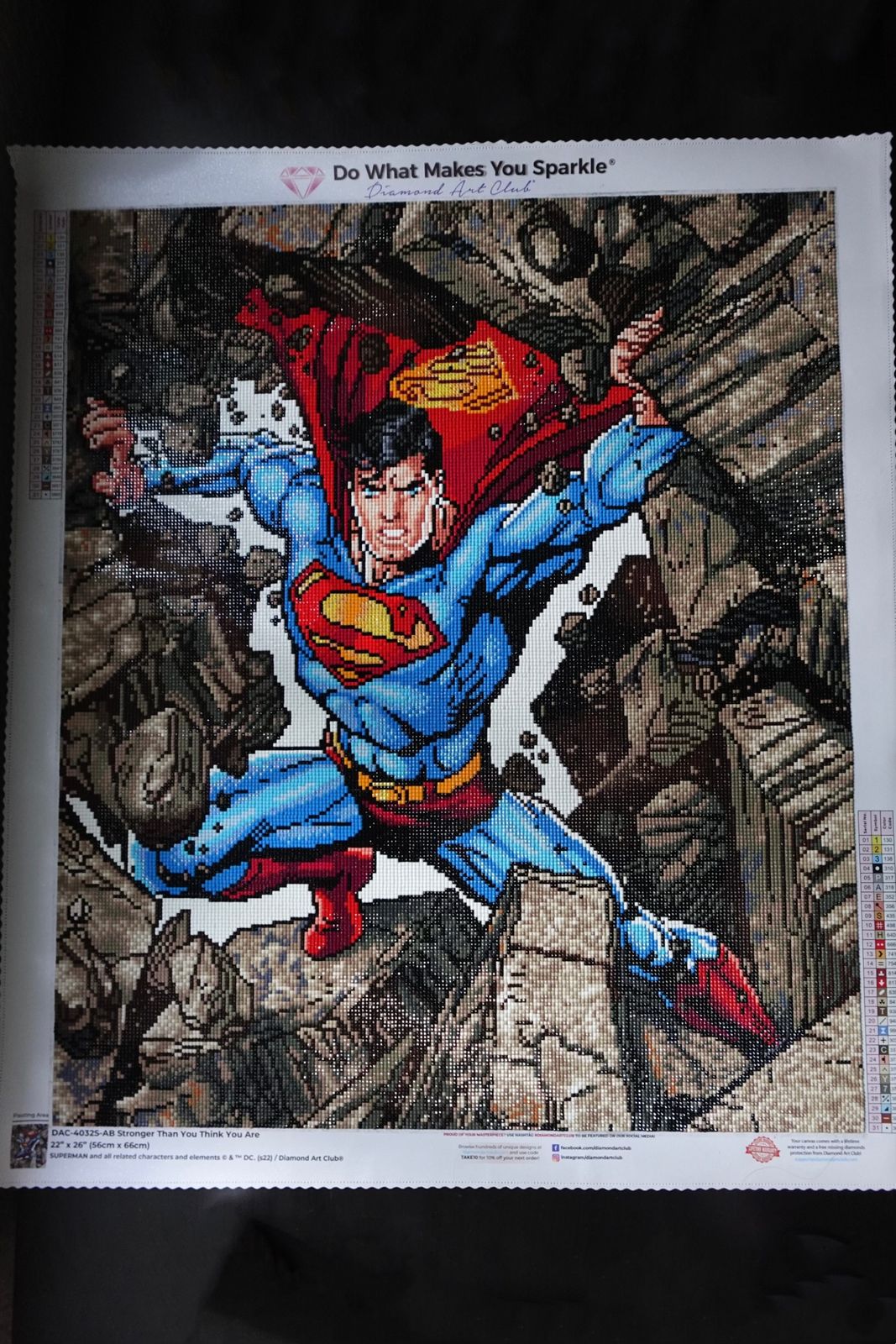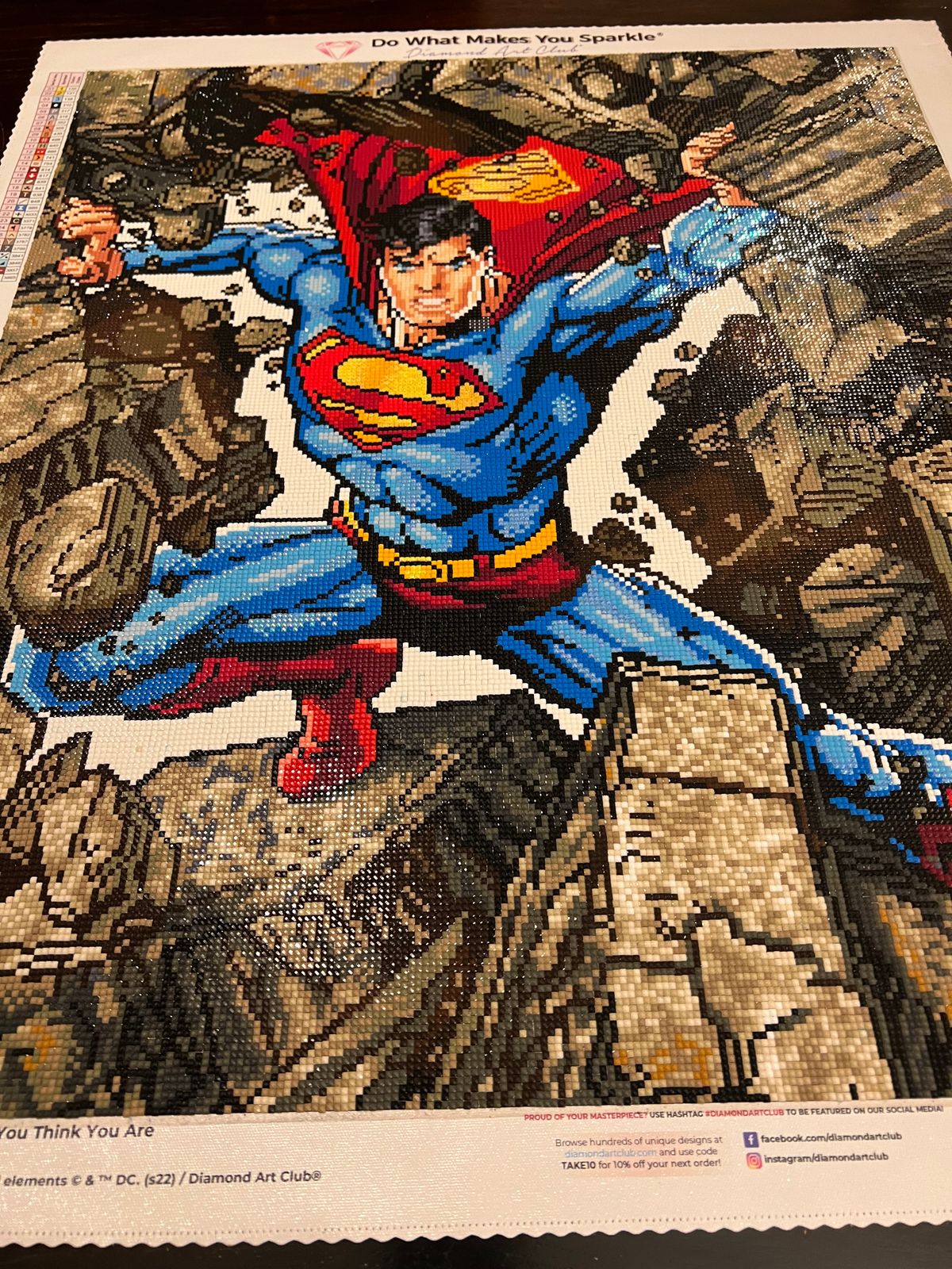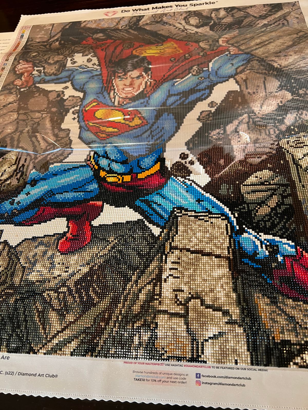 I bought this for my husband, as he's a huge superman fan. It can be hard to find more adult ish superman merchandise, so I purchased this as soon as I saw it. I was leary on the price but when i got itit was much larger then I had expected, plenty of diamonds to finish (despite dropping quite a few). Plus the special diamonds really set it off. One issue i had was the diamonds clumping together. My husband loved it and now just trying to find a frame for it!!