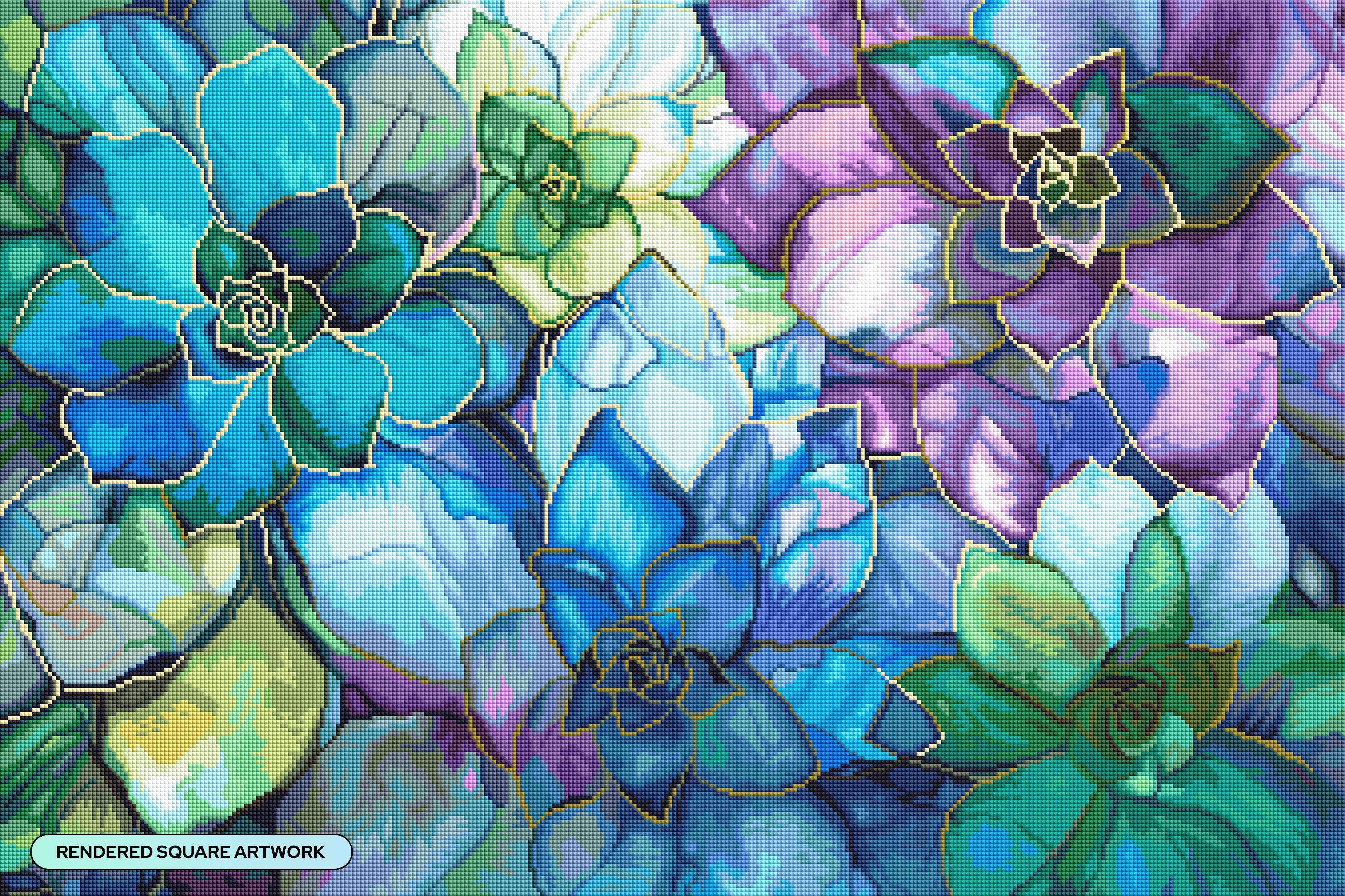 Initially I was on the fence whether to buy this one because I was skeptical if the AI's stained glass window effect would transfer well onto the diamond rendering: it didn't. The problem with this diamond art kit is that the picture of the rendered diamonds has been photoshopped too much, it's been made brighter, lighter, and more vibrant than the actual diamonds on the canvas so that the colors that are right next to one another but don't make sense there are blended a bit better.