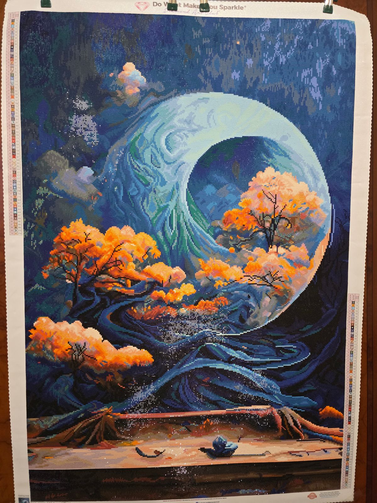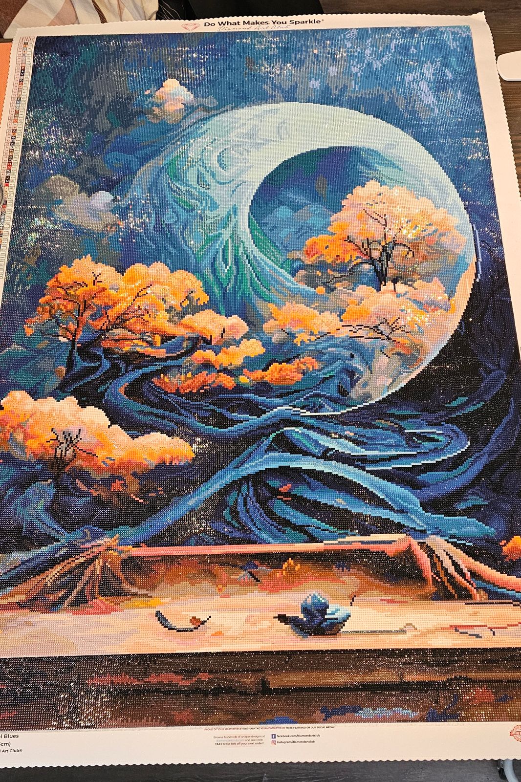 Almost halfway done and it already looks amazing. Working with all the different blues never got tedious, though to be fair, there's a lot of blue :) I feel like the contrast between the moon and the trees looks even better in person, compared to the reference picture