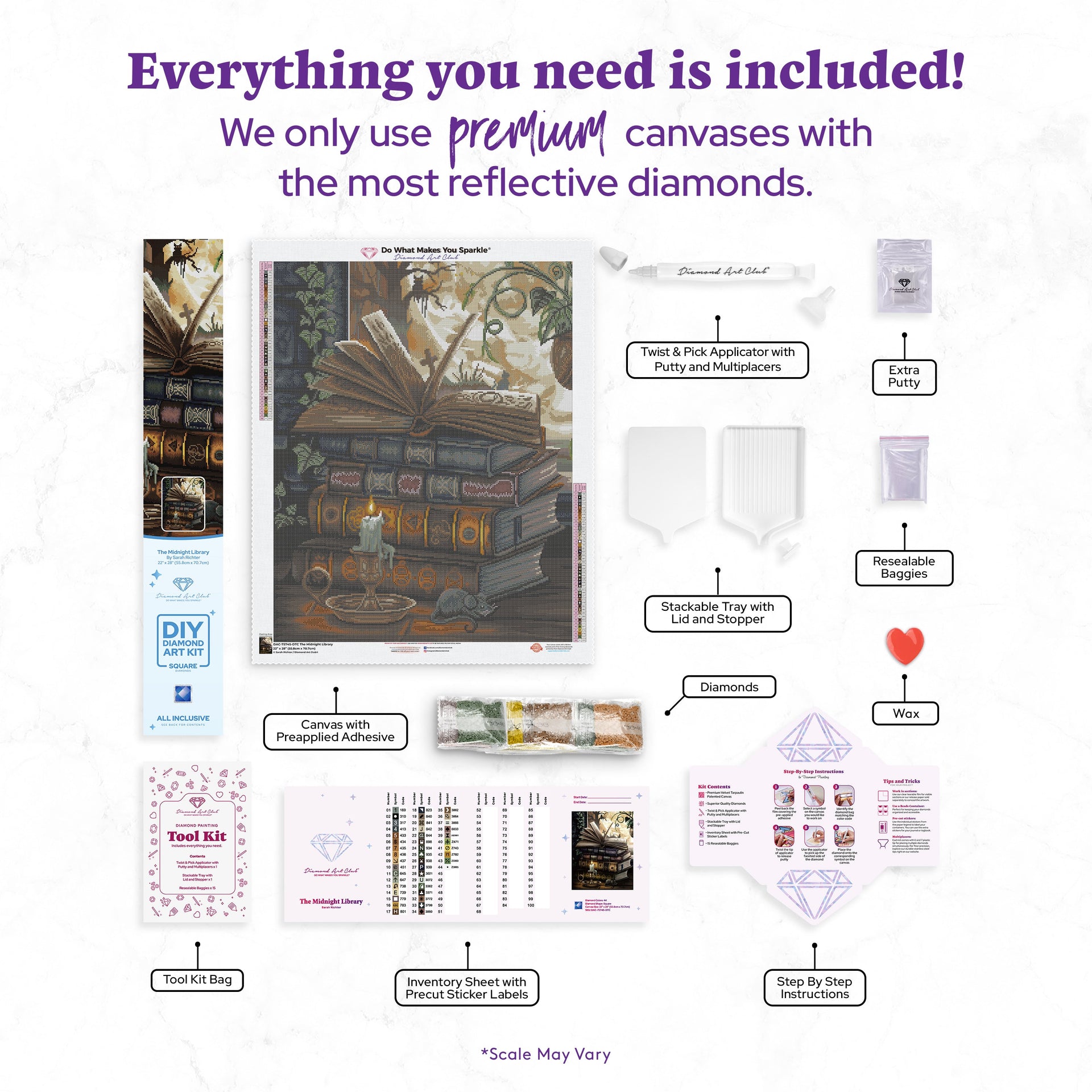 Canvas x 1, Diamonds, Tray x 1, Applicator + Grip x 1, Wax x 2, Tweezers x 1