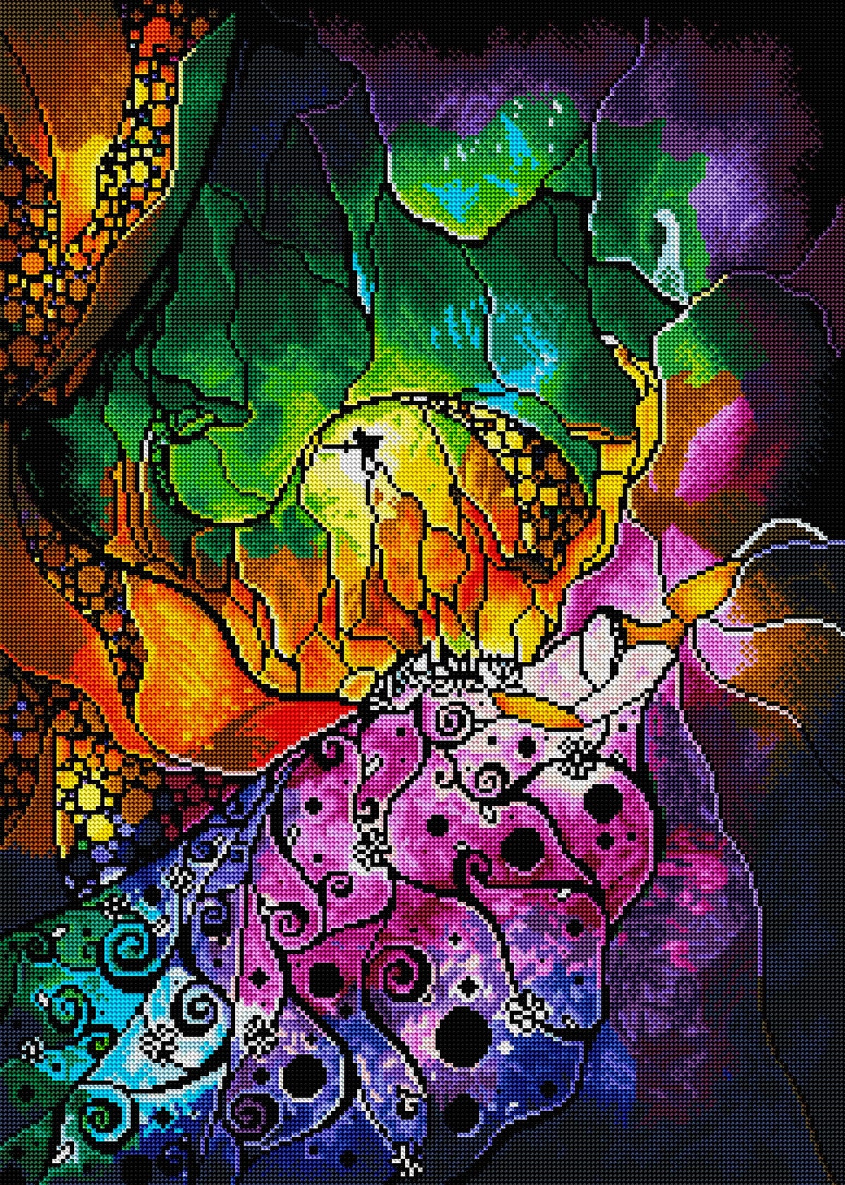 Such a beautiful painting! The colors are vibrant and the picture itself is so beautiful! I love working on it! The only down is that there are som areas that do not transfer well from painting to diamond painting in The top in my opinion (light blir on The green) so Ive changed them. Easy piece to work on due allt of color blocking.