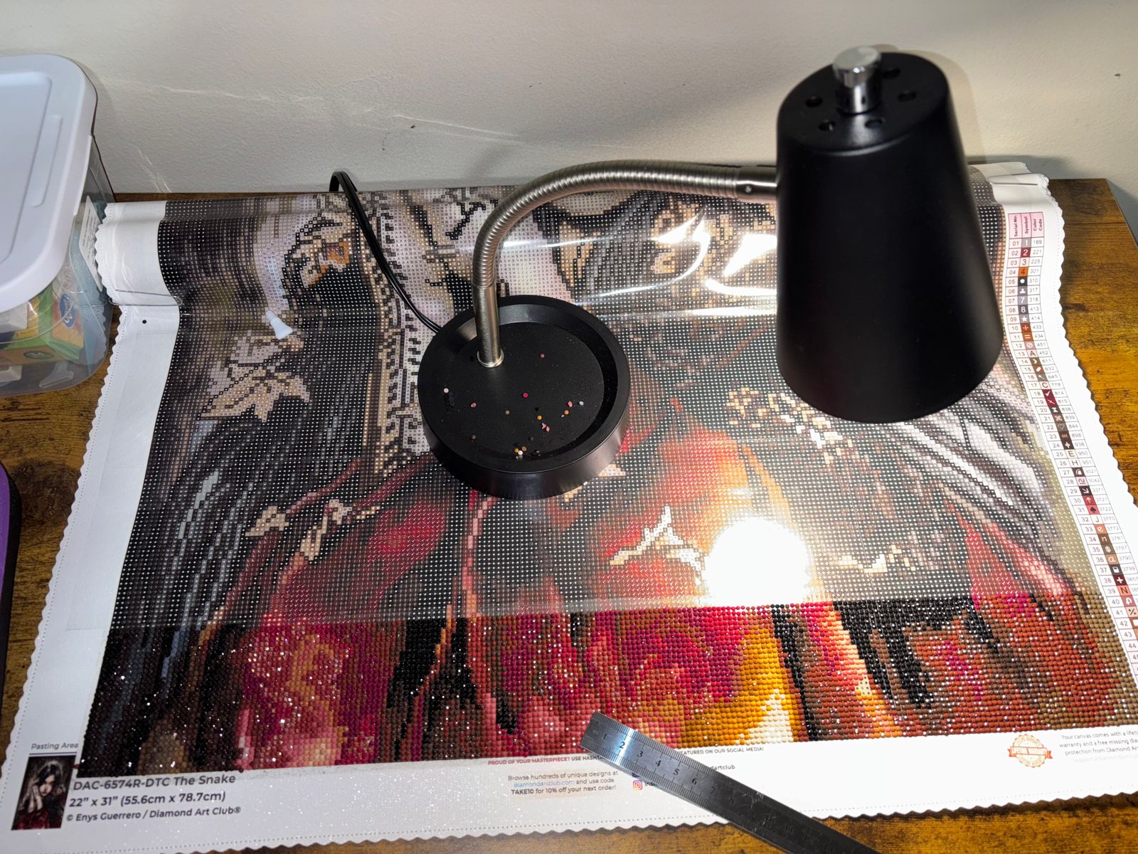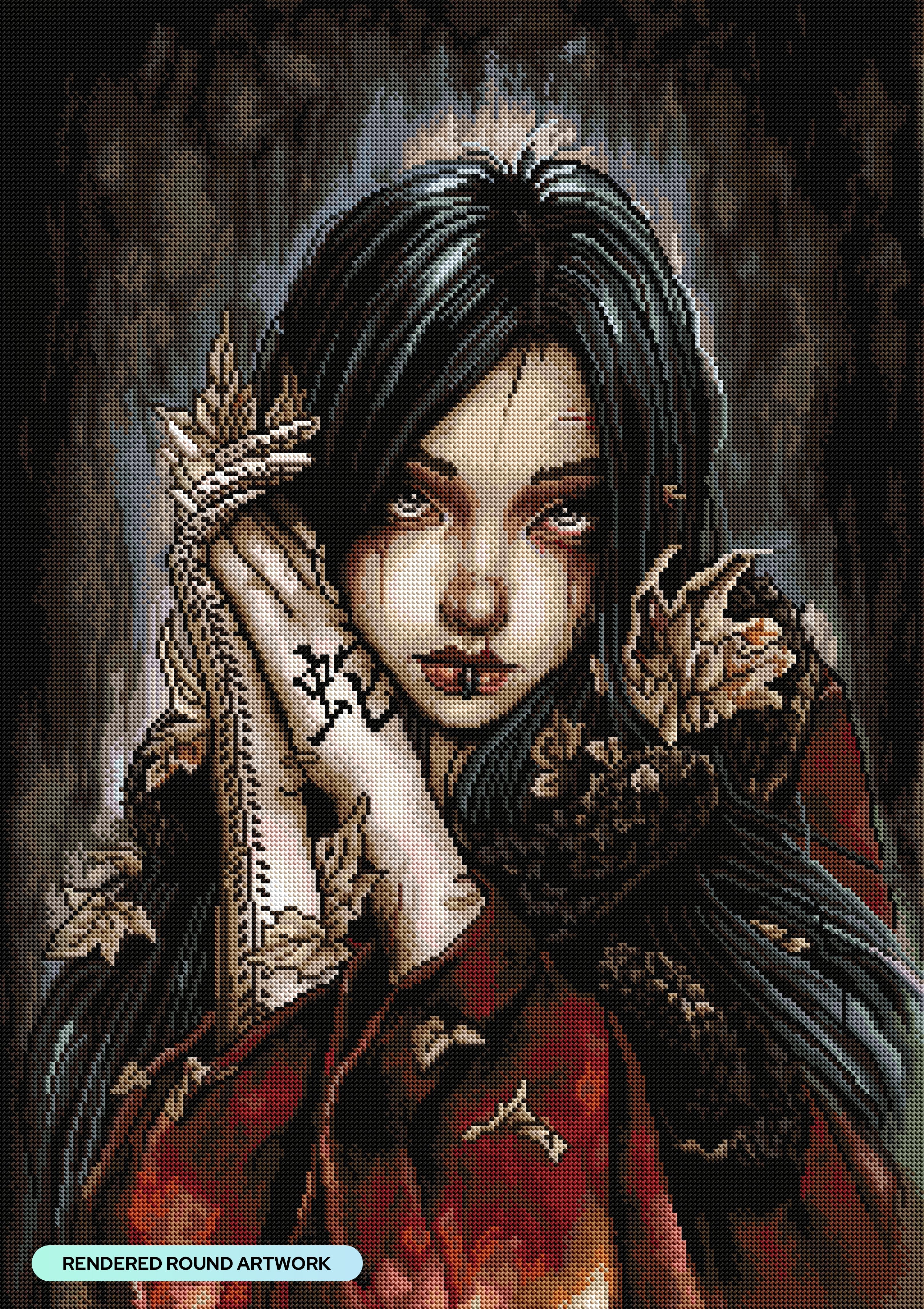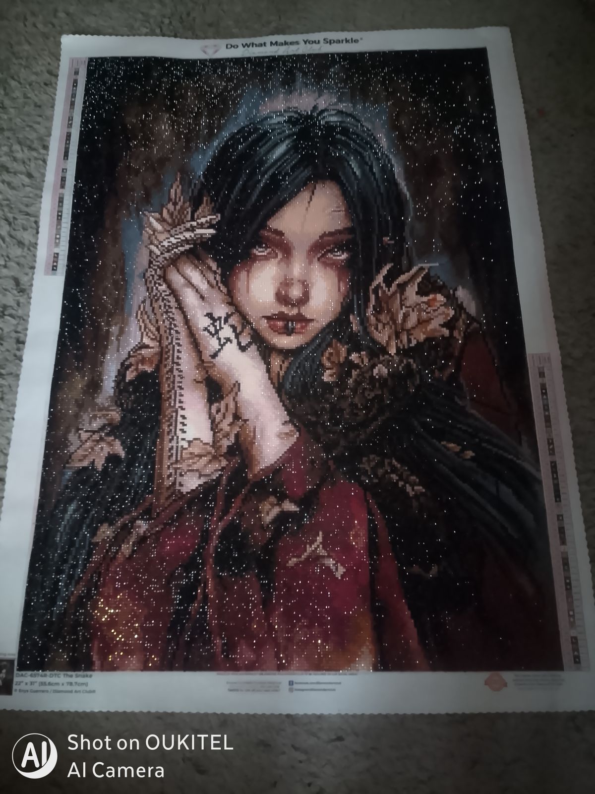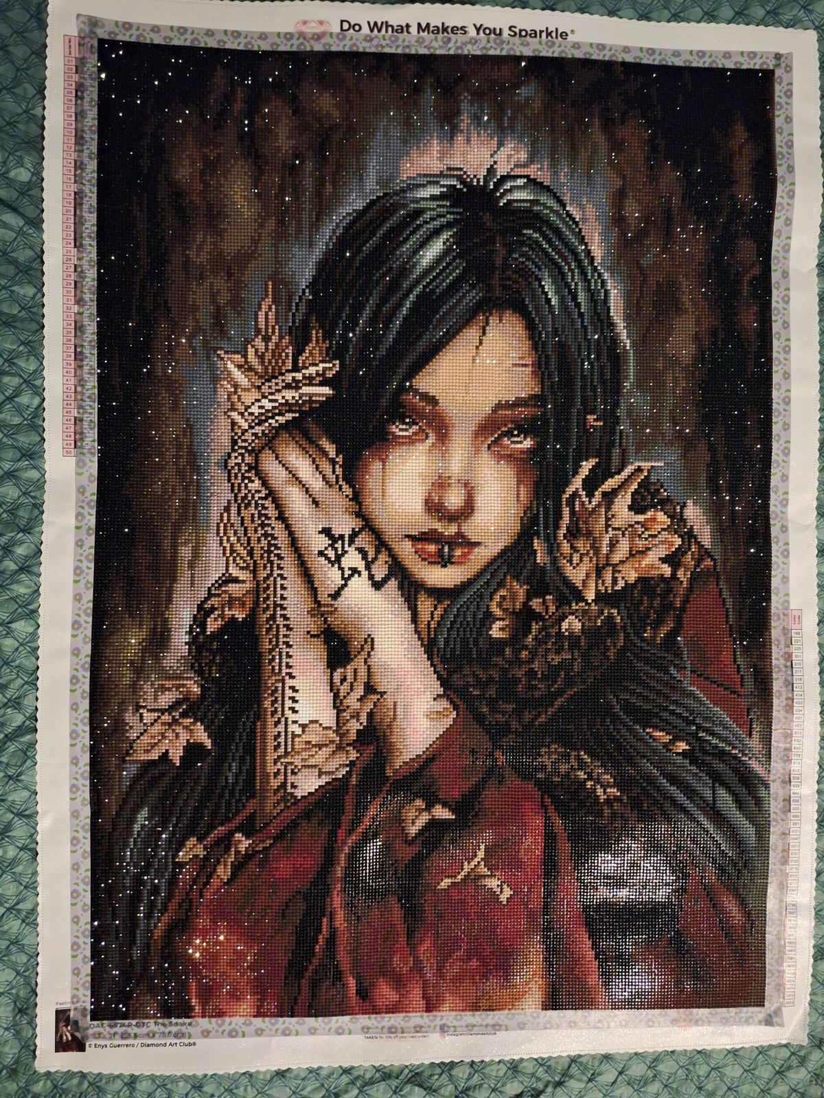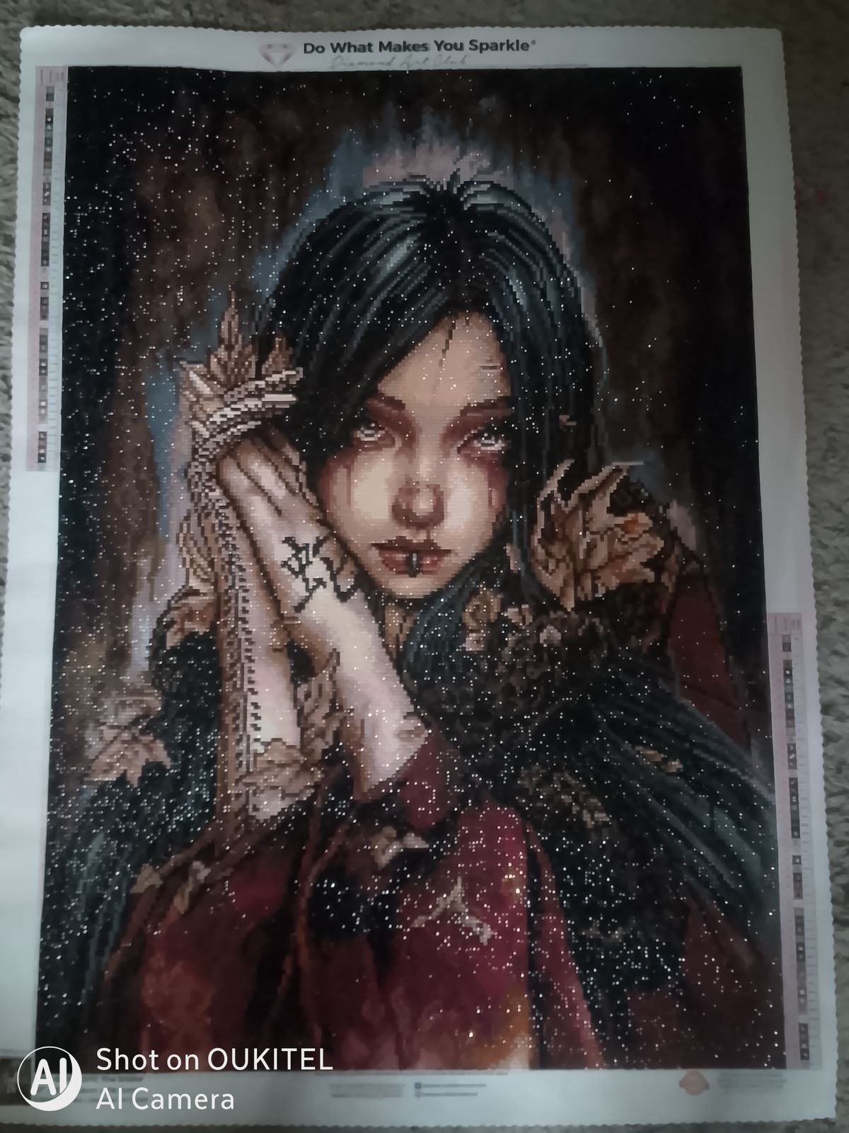I fell in love with her face so I purchased this painting. It was my first time trying out a dark-themed painting. As expected, there were lots of 310’s, 938’s, and 3771’s. Having lots of 310’s did help me get through it fast. I did run out of one colour, 3722, and some drill fields were unclear, especially heart symbol (see picture). In dark areas, some symbols could be swapped to other symbols because it was hard to distinguish them. I love how the painting is turning out to be. I wasn’t sure at first why this painting was made bigger than it should be but as I worked through it, I’m loving all the details and the soft finish that round paintings give. Only having 1 AB is pleasant. Mine came with a trading card as well. Enjoy whoever is getting this painting!