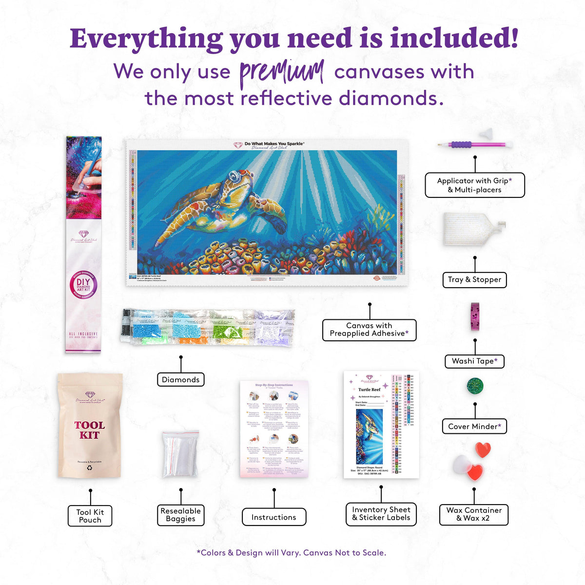 Canvas x 1, Diamonds, Tray x 1, Applicator + Grip x 1, Wax x 2