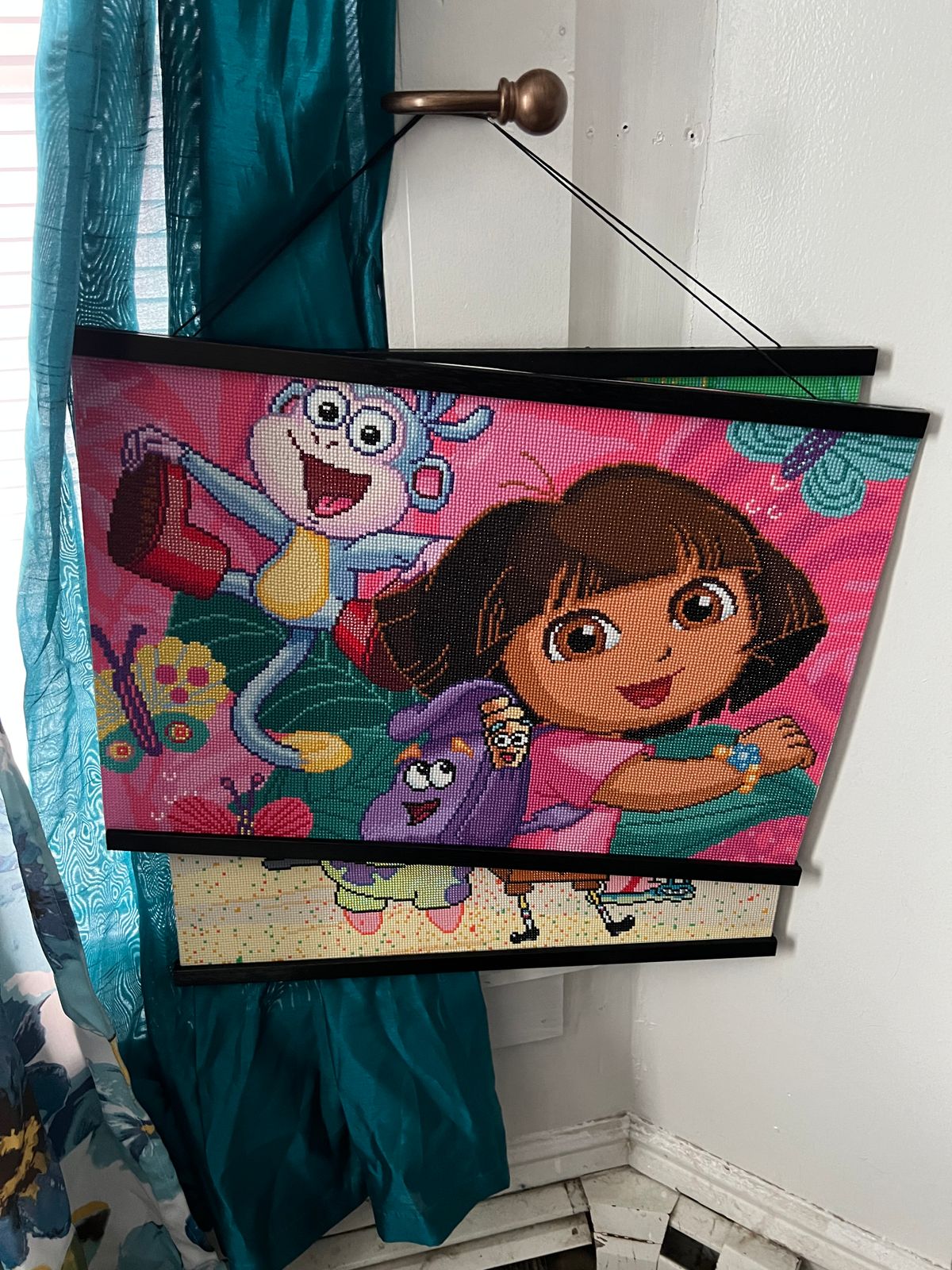 I loved all the bright colors in this one. My daughter loves monkeys and is just recently getting into watching Dora so it's nice to have this hanging up in her room.