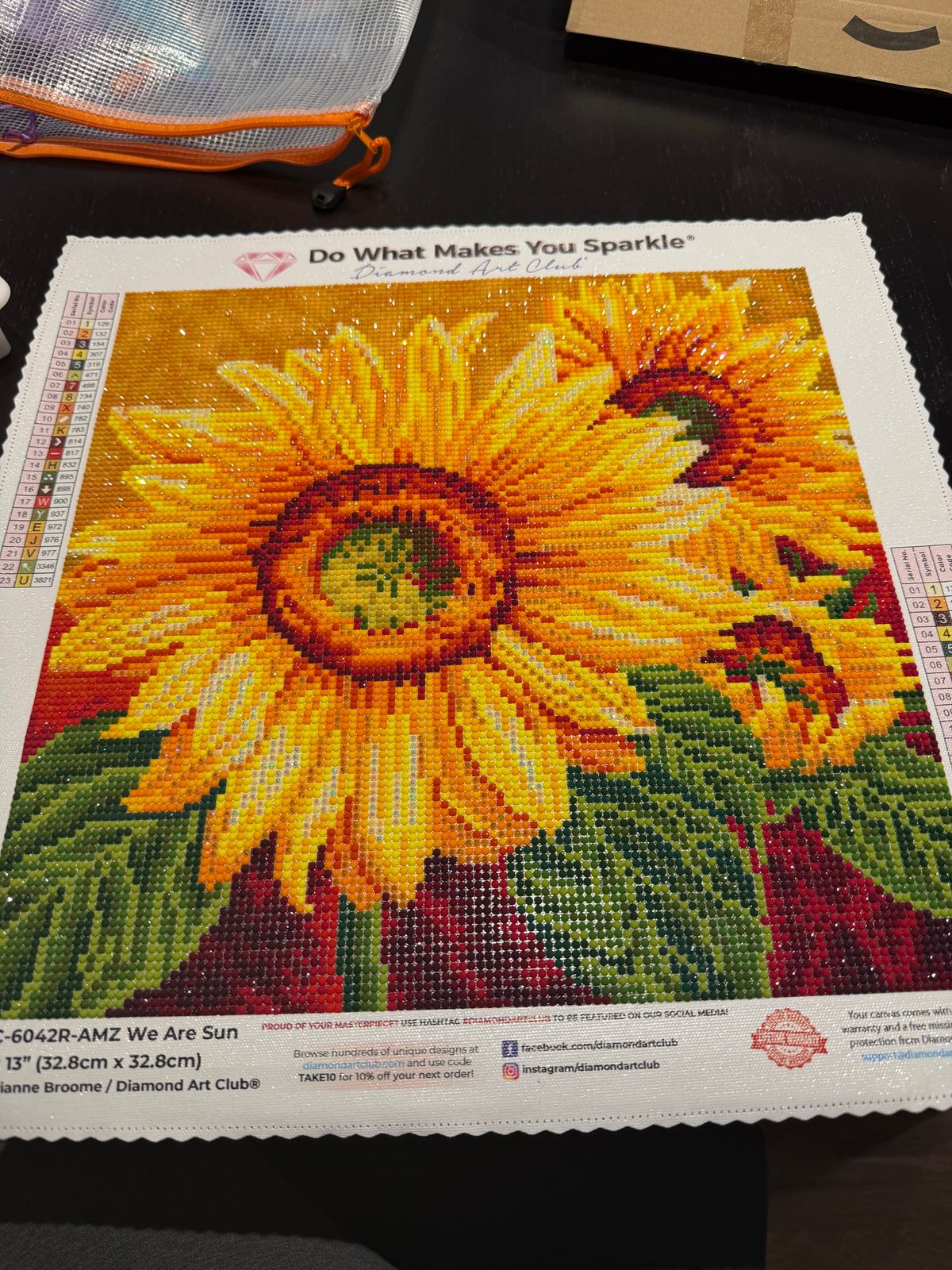 I love sunflowers, so I selected this art to add to my flower collection it was very easy to follow. It is very sparkly and beautiful. Highly recommend