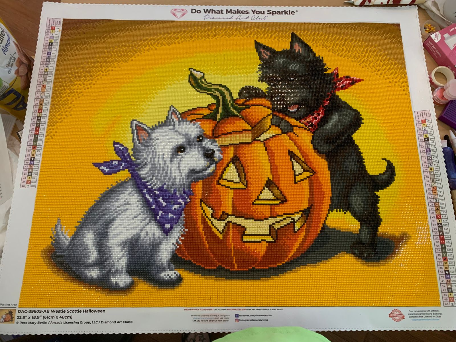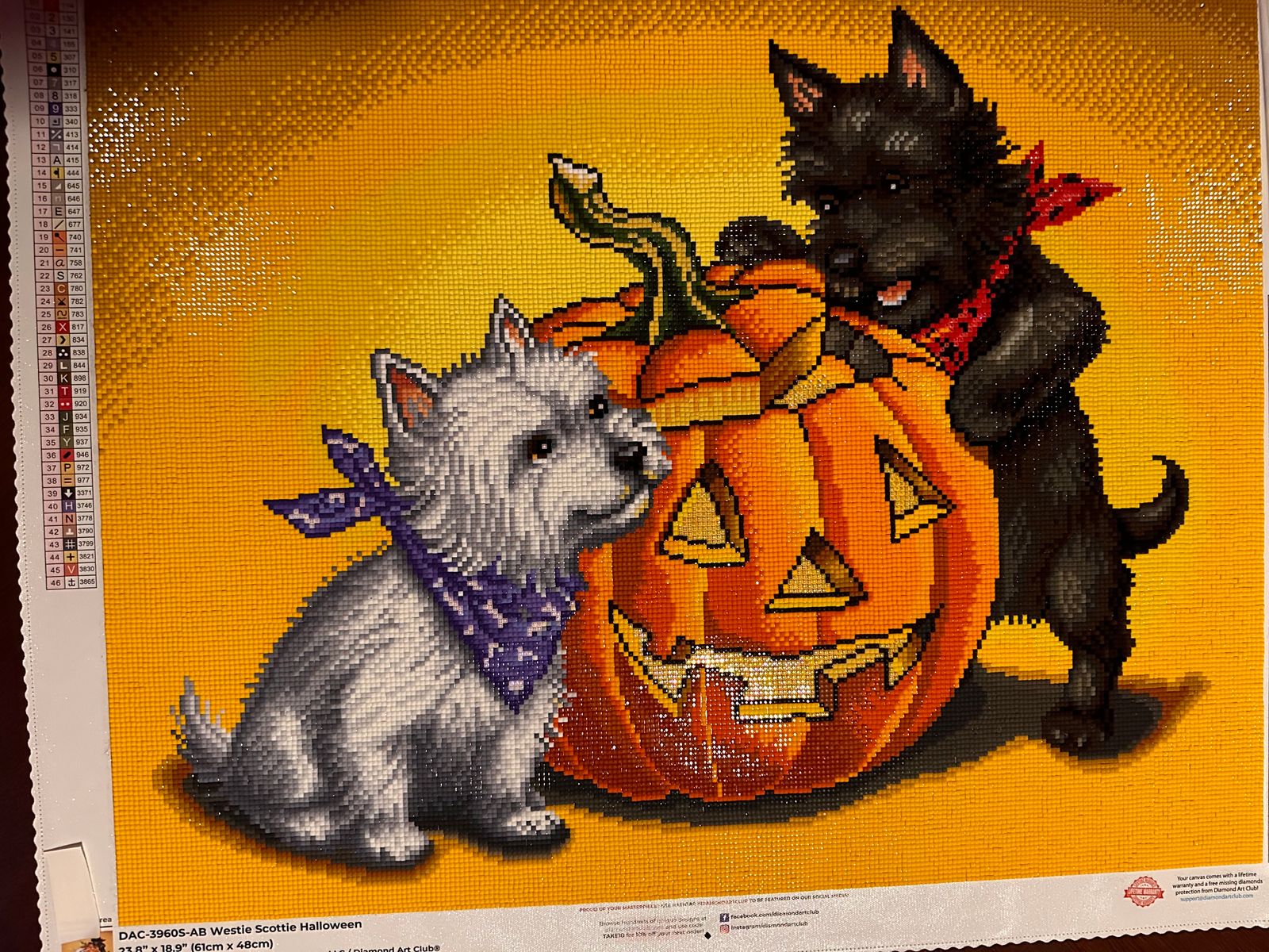 I bought this one after Halloween. But I can't wait to display it next year. The little Scottie dogs are adorable. I love doing all the dog paintings. The charting on this is really good. Diamond art always has the best.