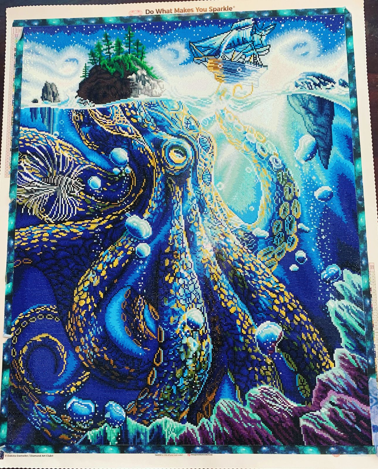 I enjoyed the entire process of working on this canvas. I felt like it had a lot of something that's a cross between confetti and color blocking. It was like confetti but in larger sections than individual diamonds., or like color blocking but only for a small area at a time. I will call this small area color blocking. The final image is awesome and highly detailed. This was my first canvas with square diamonds, and my first canvas with AB diamonds, and I learned a lot while working on it.