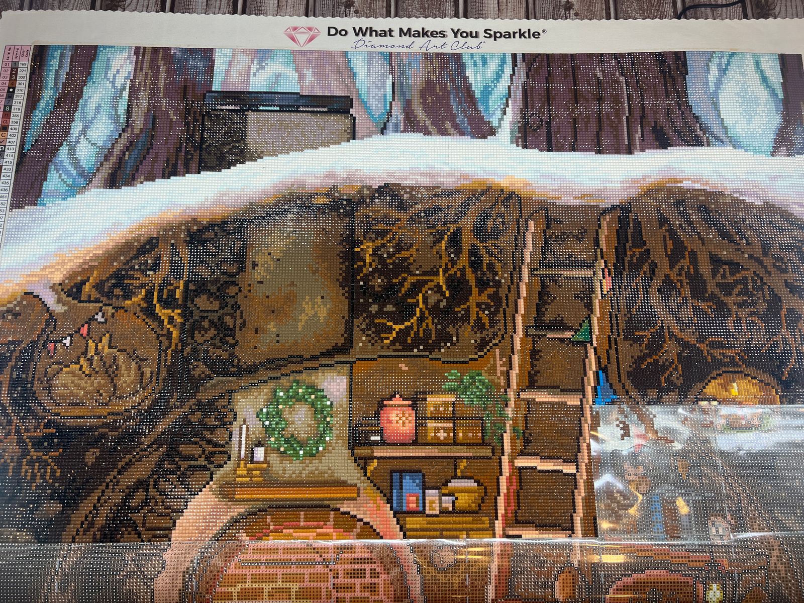 When I first saw the design I was mesmerized because I love the serene feeling it gives me, with the twigs crackling in the hearth, and the books, almost have me feeling as cuddly as the cuddling bunnies. I love this illustration so much that I kept sending it to my friends and telling them about it☺️ Even though it's summer right now where I live, I love how investing my time into making this piece transports me to a serene winter. Perhaps it's the peace diamond painting gives me that calms me down! ❄️ It's also the very first canvas I purchased that measures so large, so it proves a bit challenging but I have enjoyed the process of revealing the gorgeous design bit by bit ✨