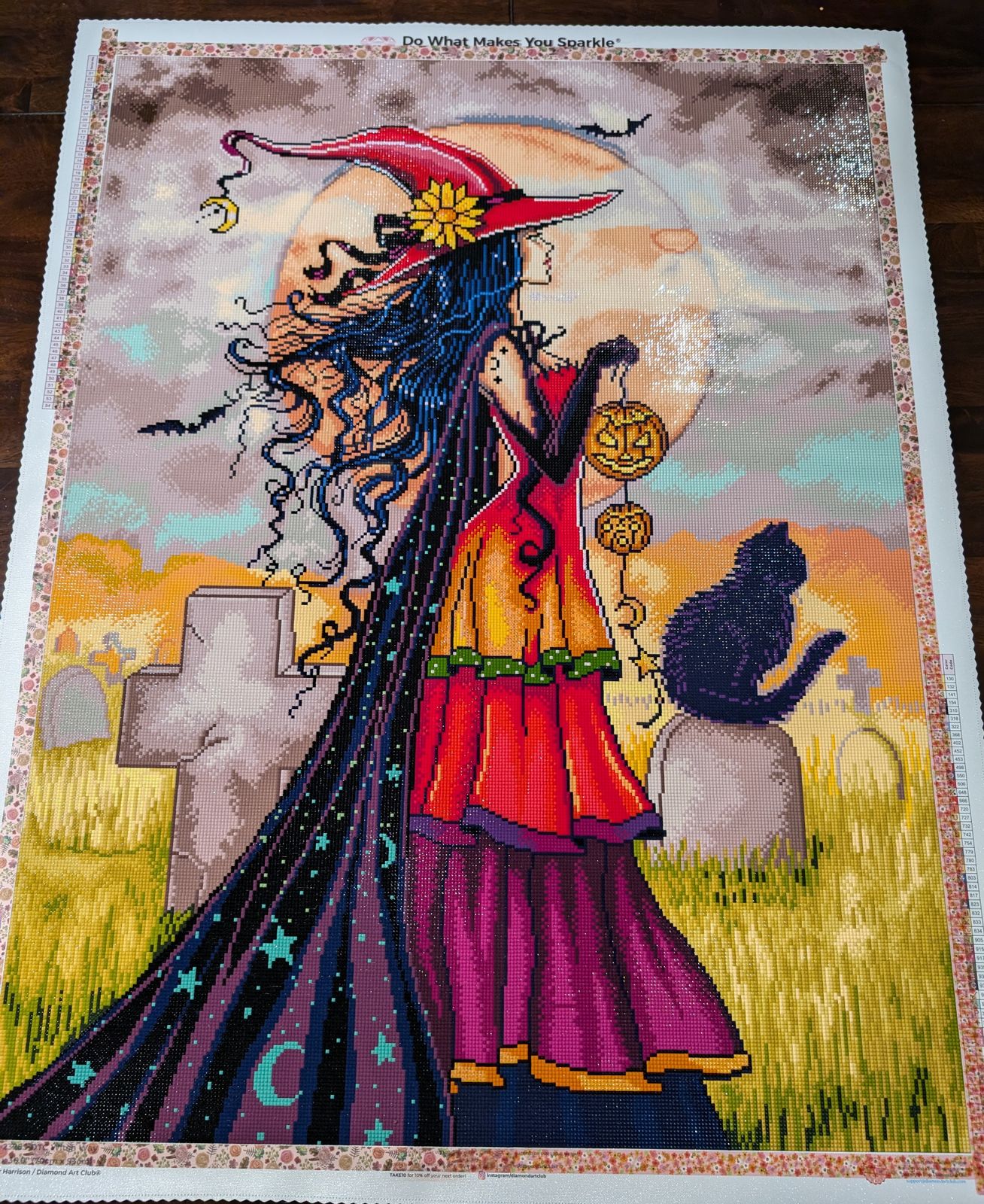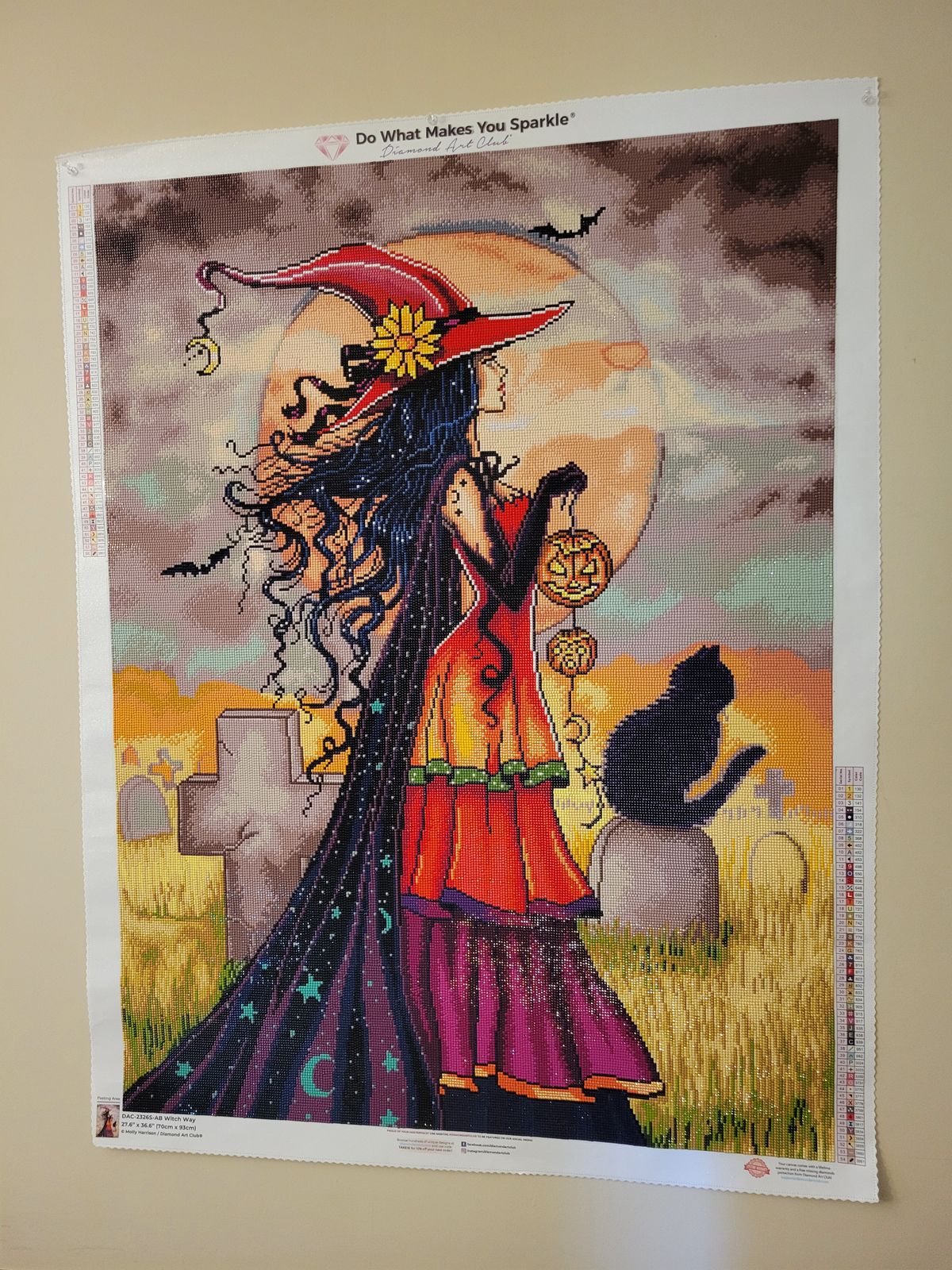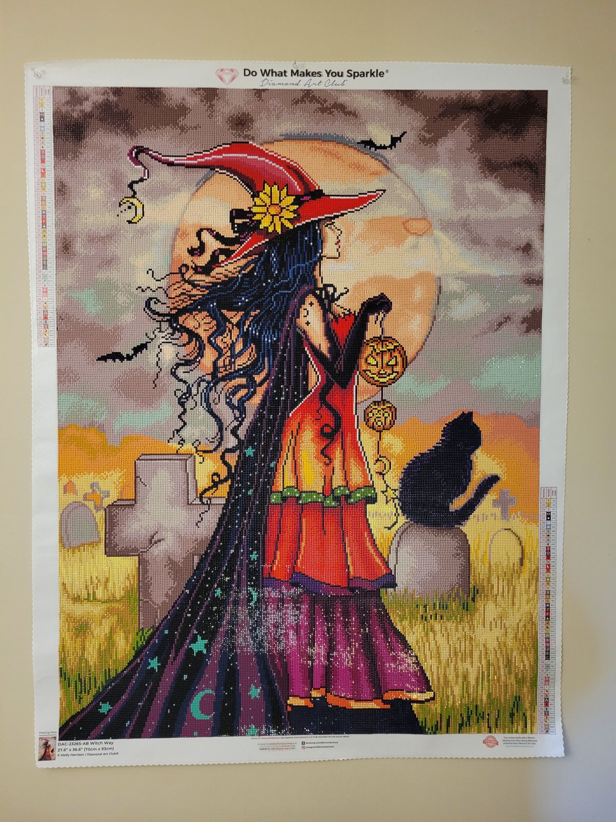 I’m not quite done with this canvas but I am so in love with it! The witch is just beautiful. I love the tendrils of her hair, her gown is gorgeous and the kitty is darling. I replaced some of the drills in the pumpkin with glow in the dark drills and it turned out perfect. The muted colors of the background of this piece really work against the bold colors of her dress. I usually prefer landscapes or more whimsical paintings, but this one just spoke to me. I am so happy with it that I purchased another witch, also by the same artist.