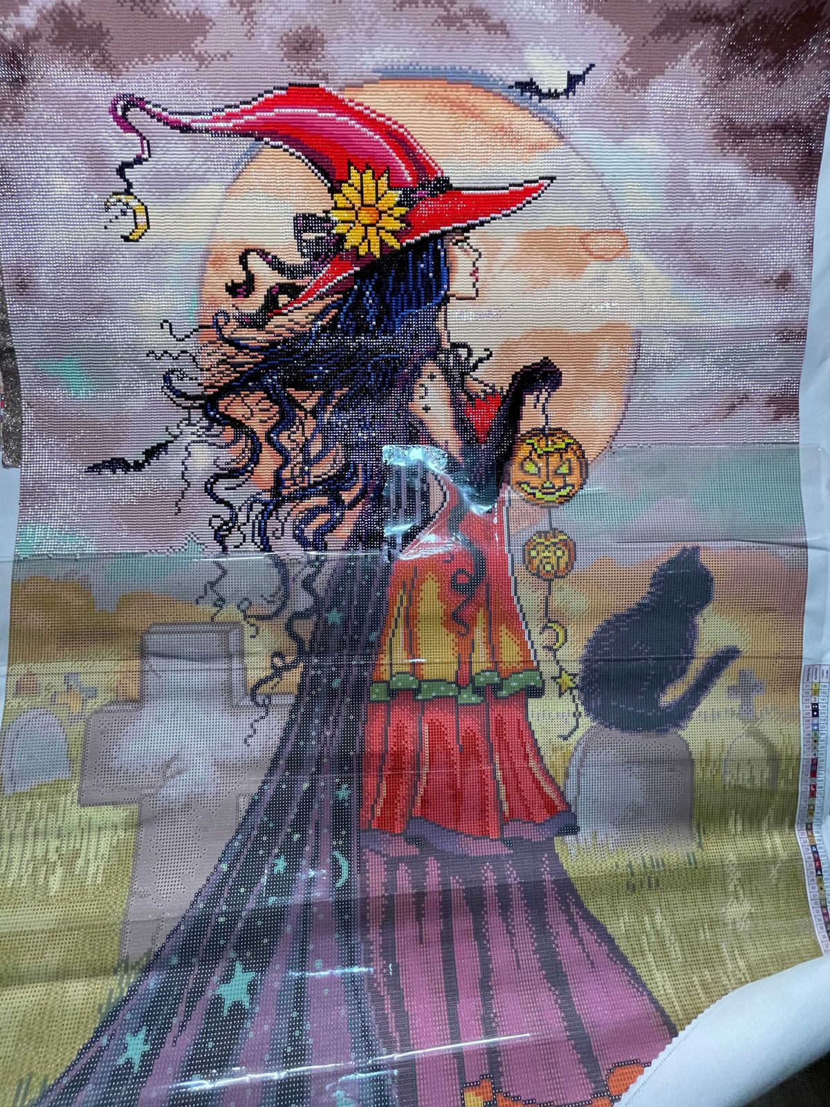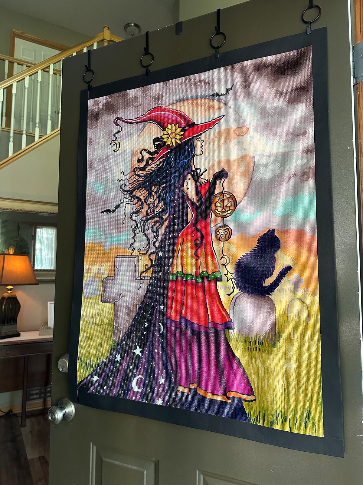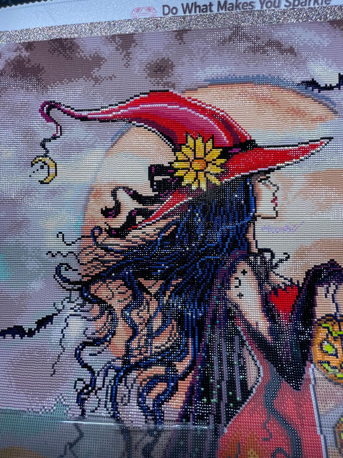I’m not quite done with this canvas but I am so in love with it! The witch is just beautiful. I love the tendrils of her hair, her gown is gorgeous and the kitty is darling. I replaced some of the drills in the pumpkin with glow in the dark drills and it turned out perfect. The muted colors of the background of this piece really work against the bold colors of her dress. I usually prefer landscapes or more whimsical paintings, but this one just spoke to me. I am so happy with it that I purchased another witch, also by the same artist.